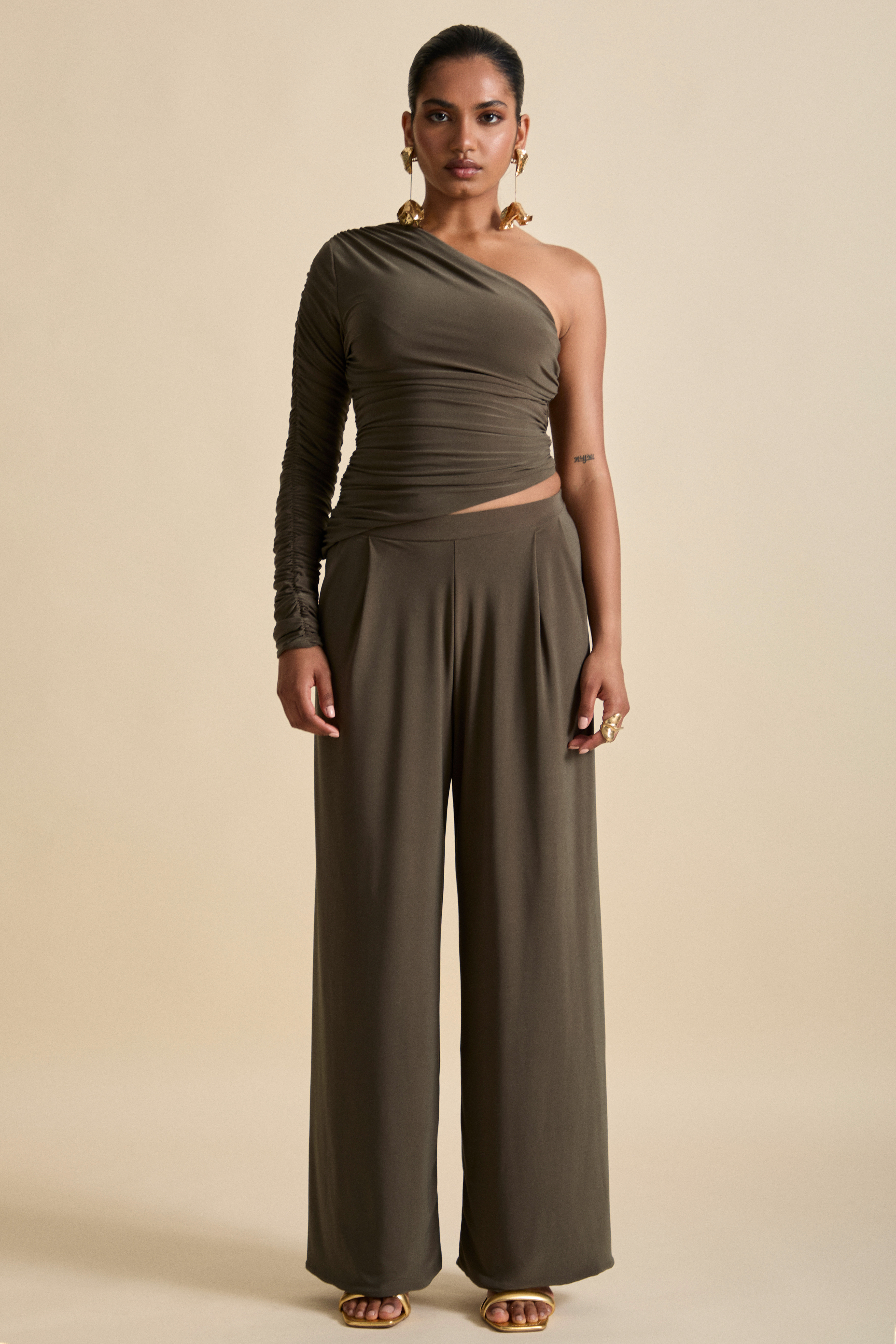 The Nepeta Set, one shoulder ruched asymmetric top provides sultry glamour paired with pleat detail trousers for the perfect merging of sophistication and elegance.