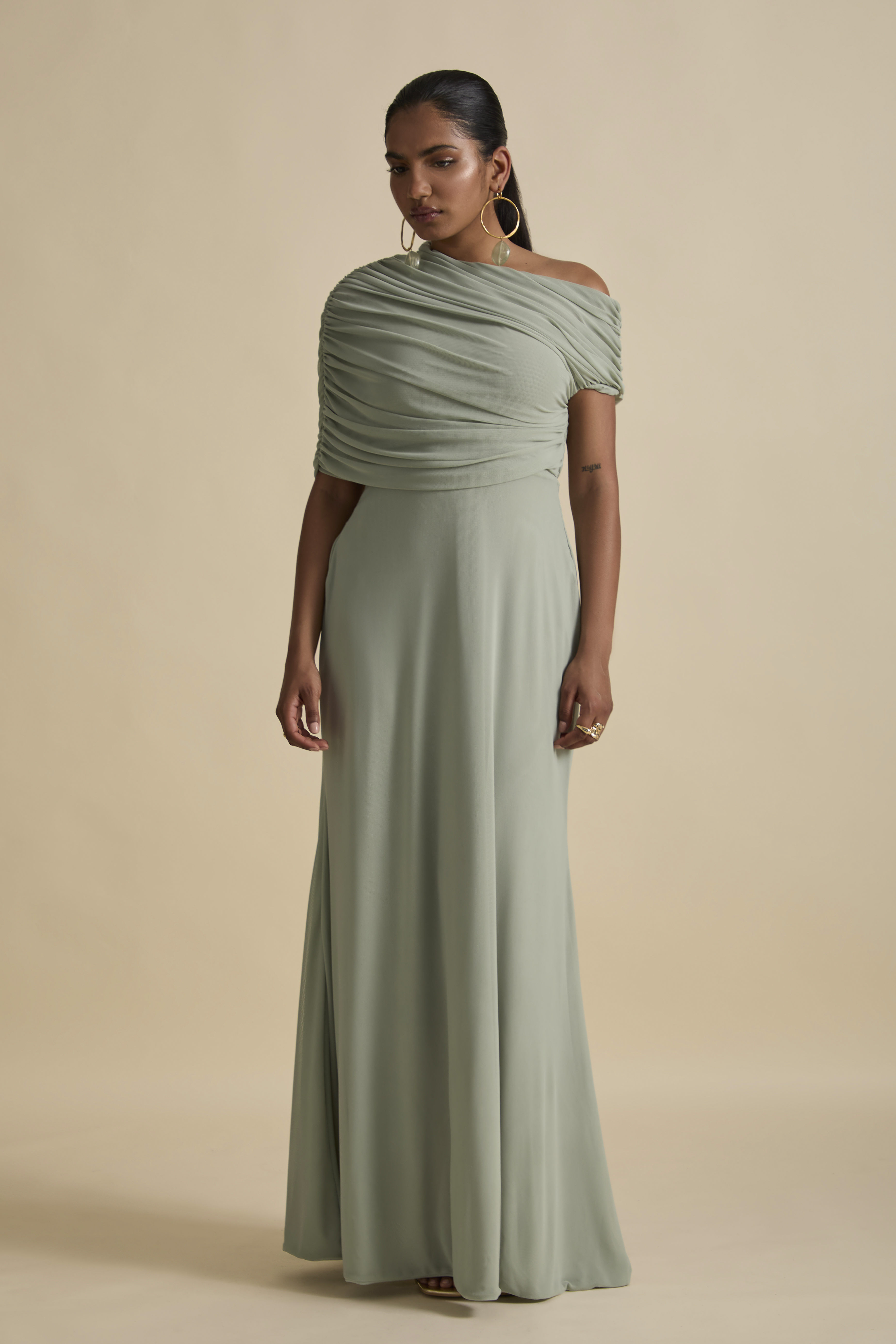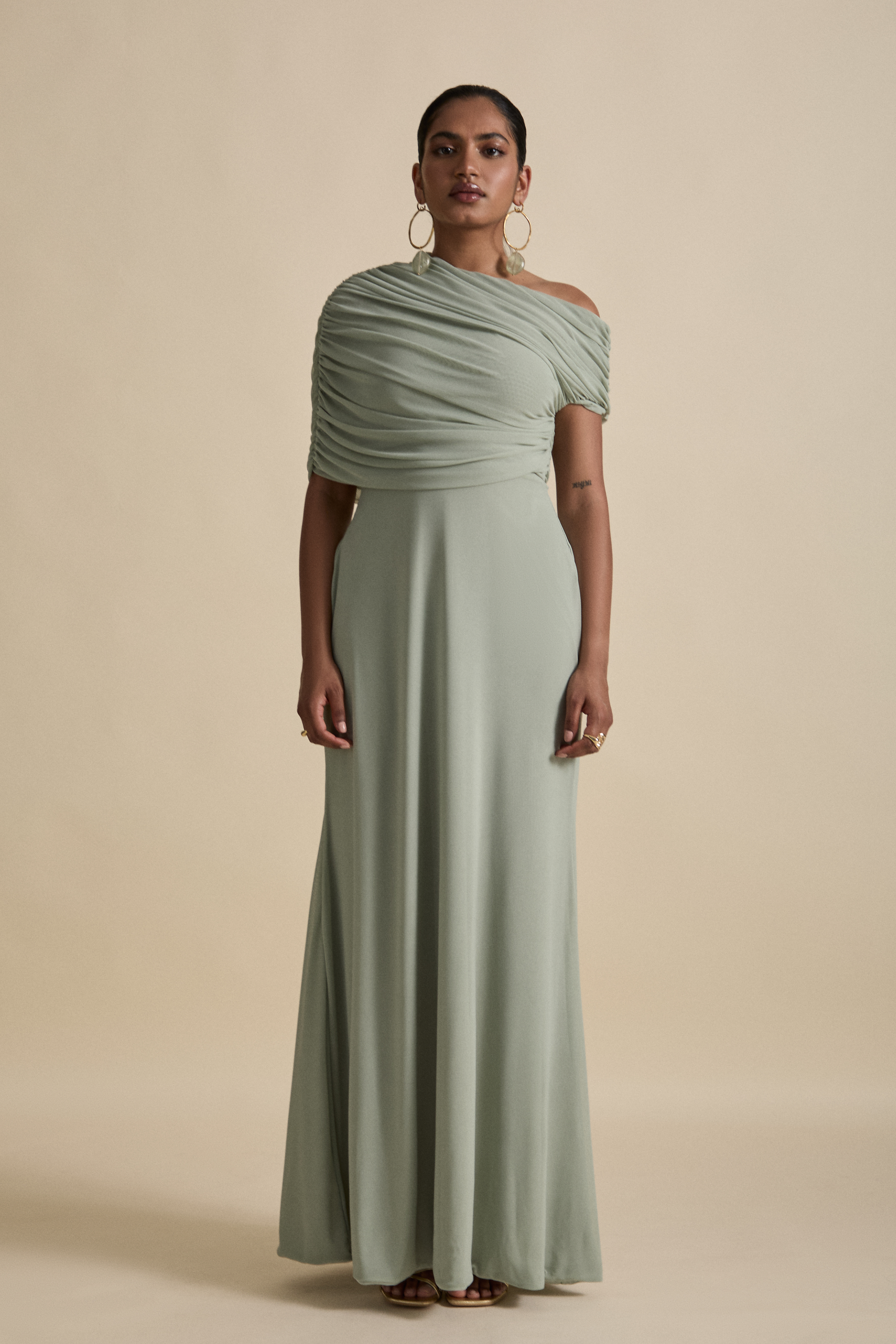 Graceful and unique, a softly cinched waist, and a sweeping floor-length skirt. Delicate neckline drape with our signature ruching details.