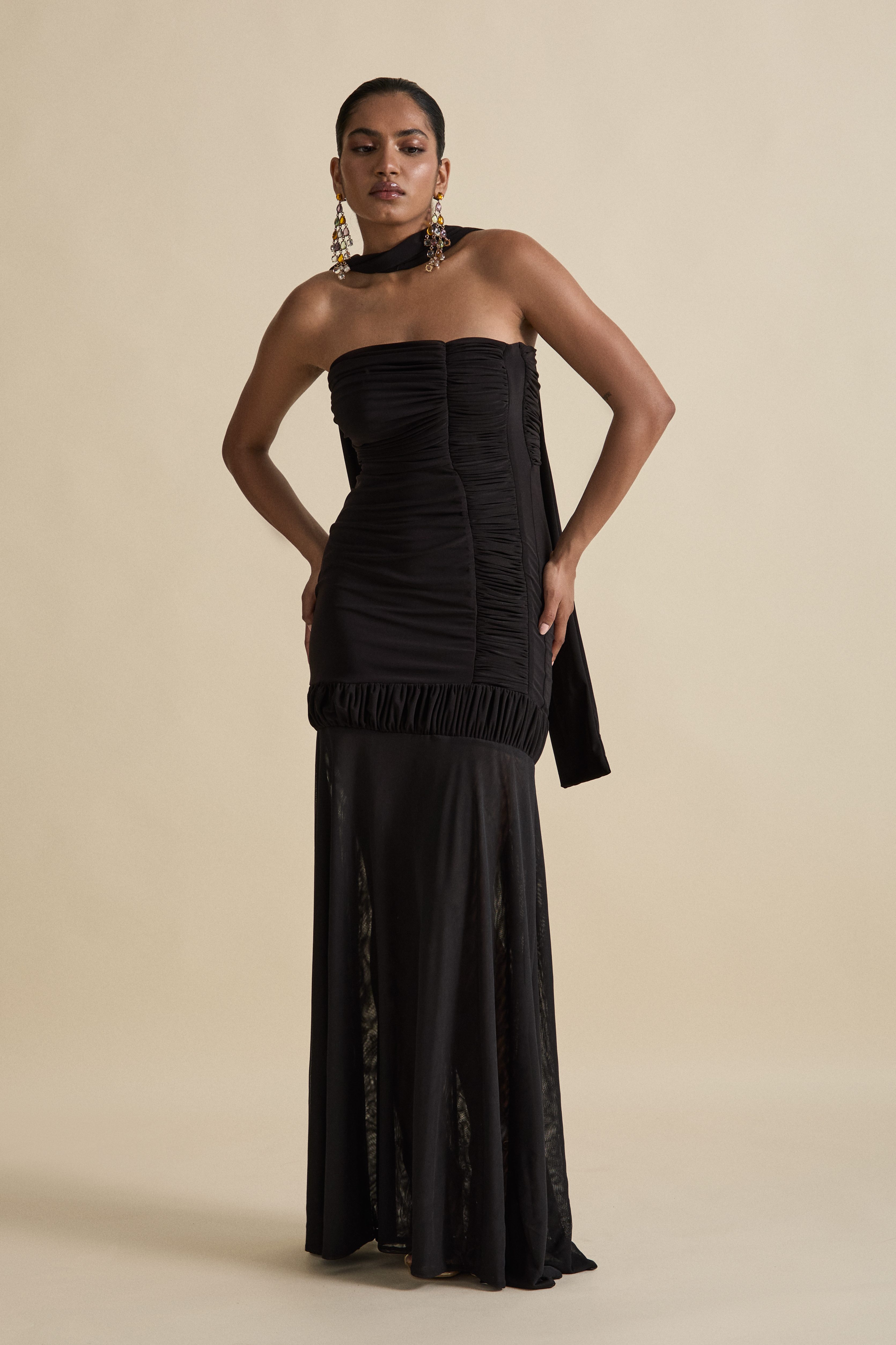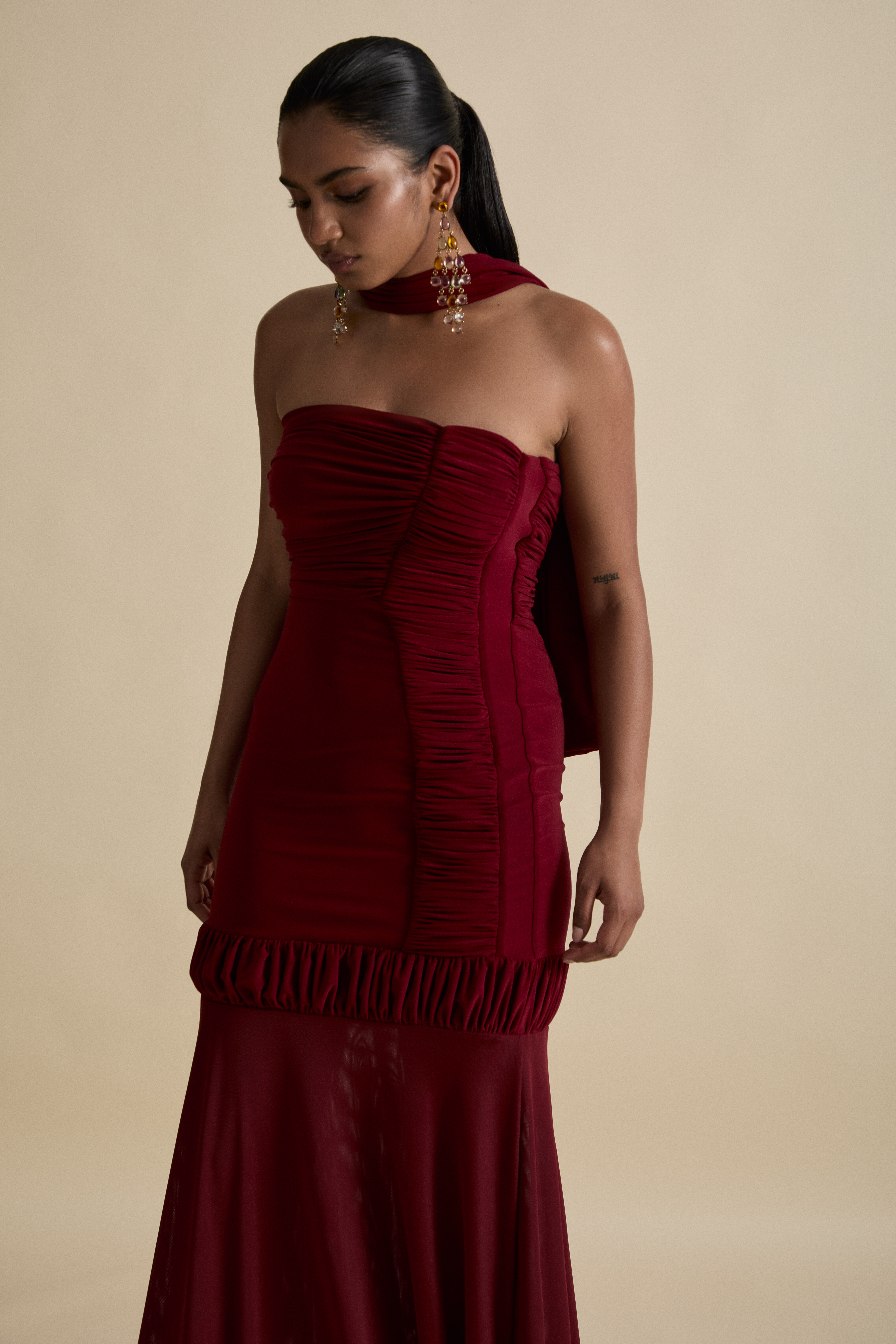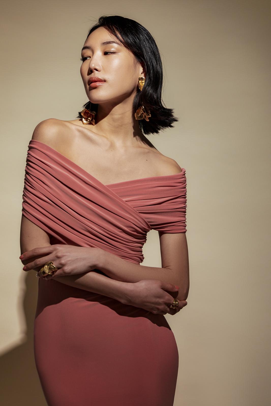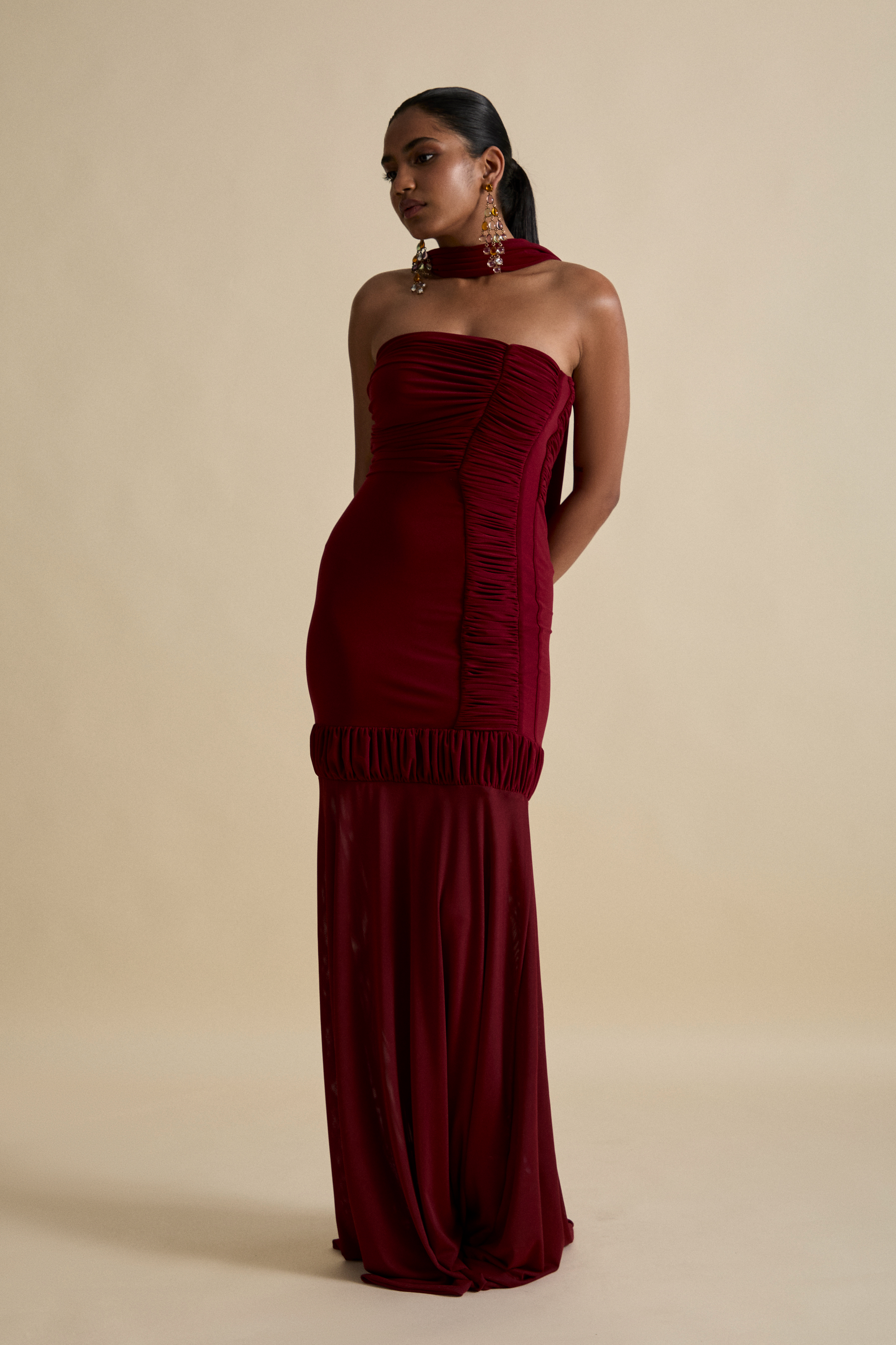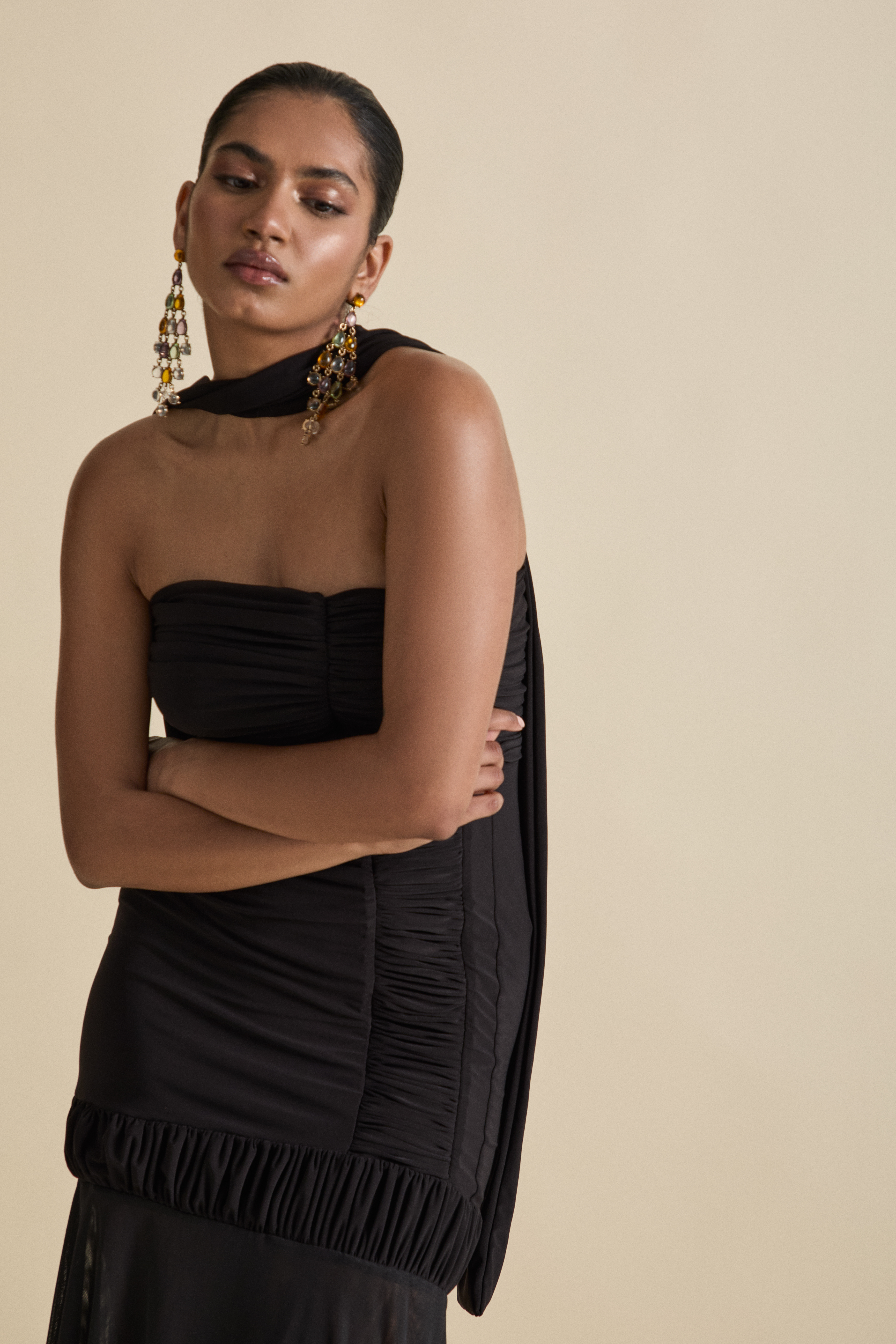 Constructed in locally sourced, premium stretch drape jersey for defined luxury evening wear.