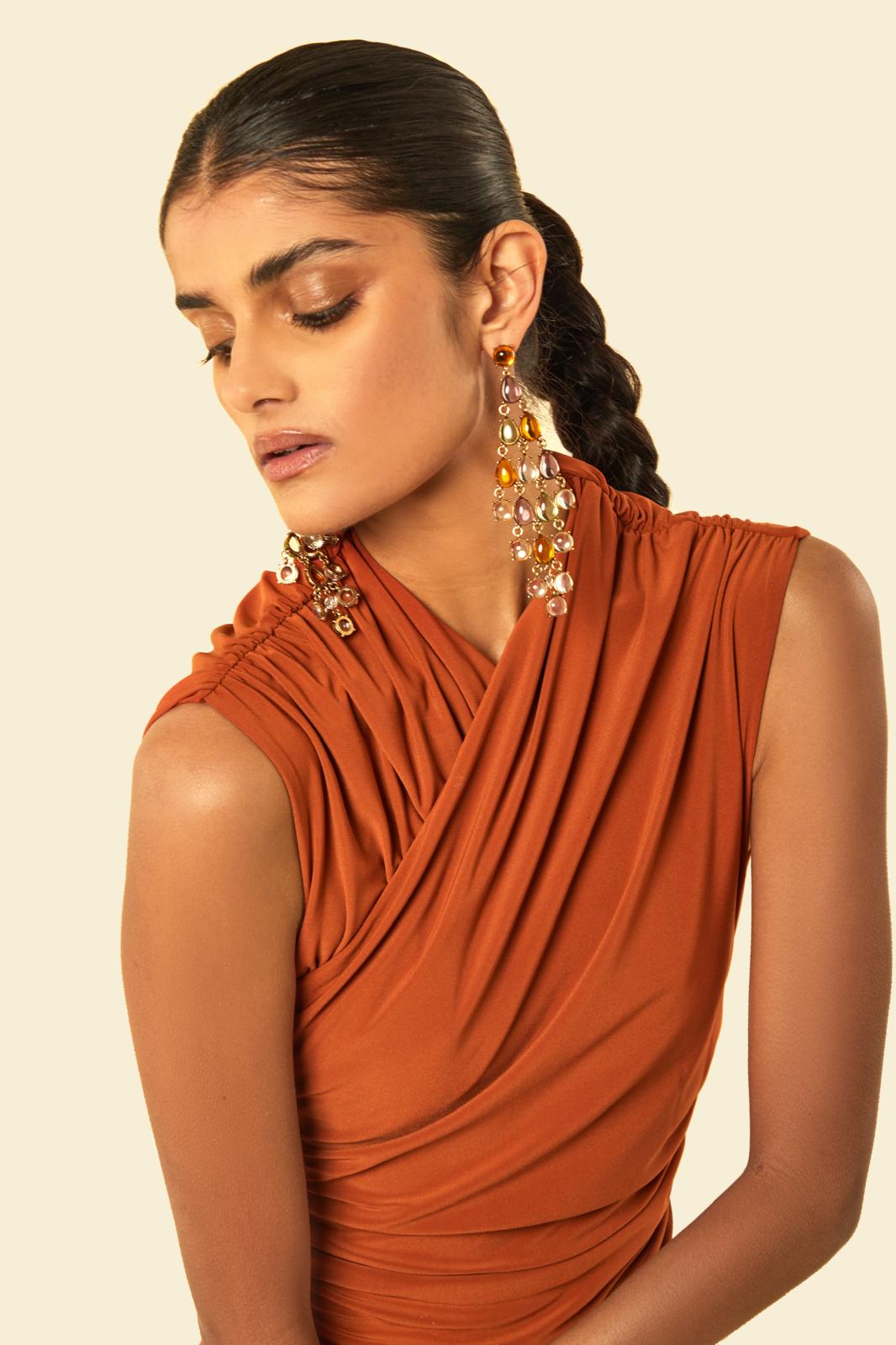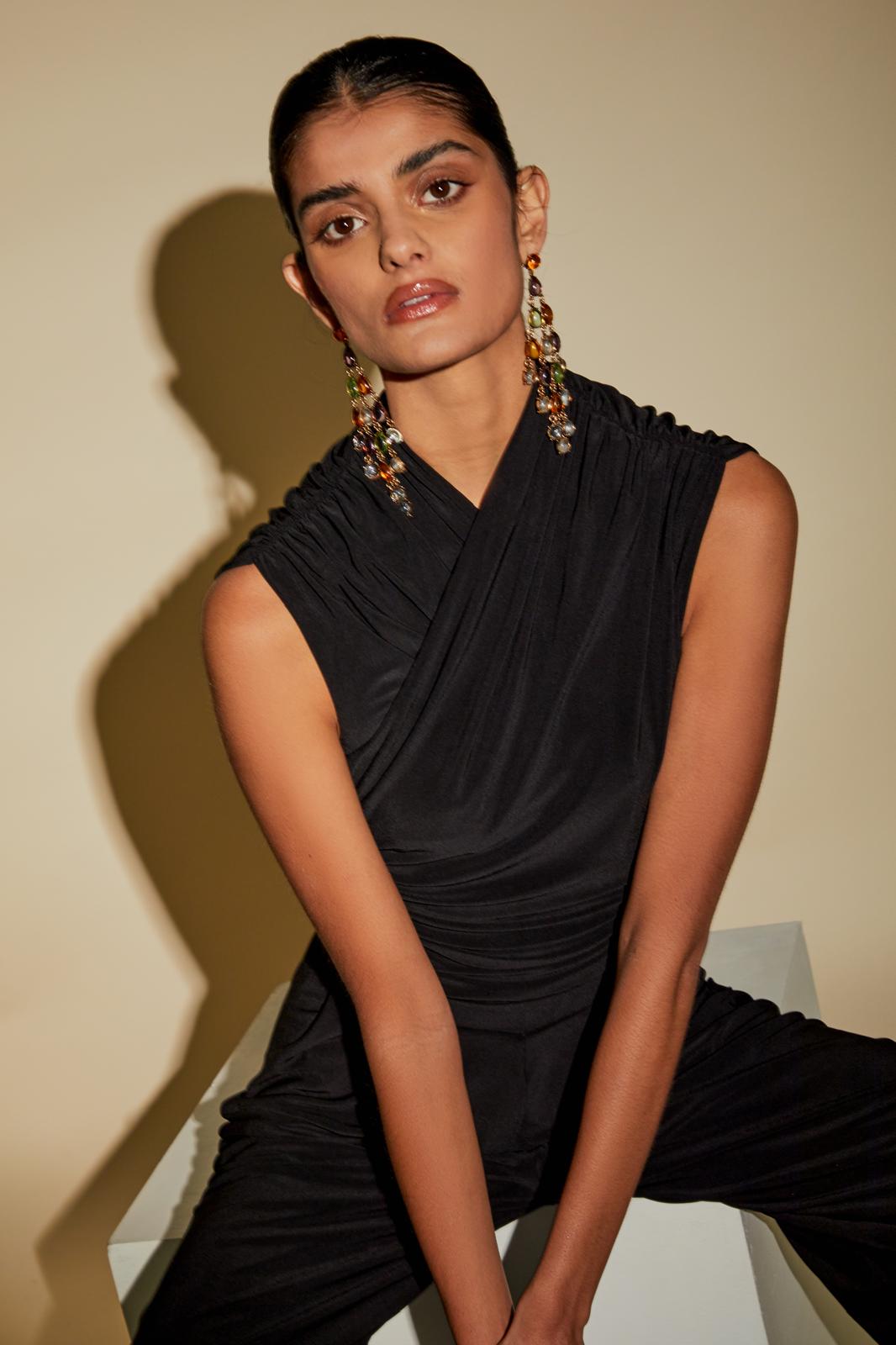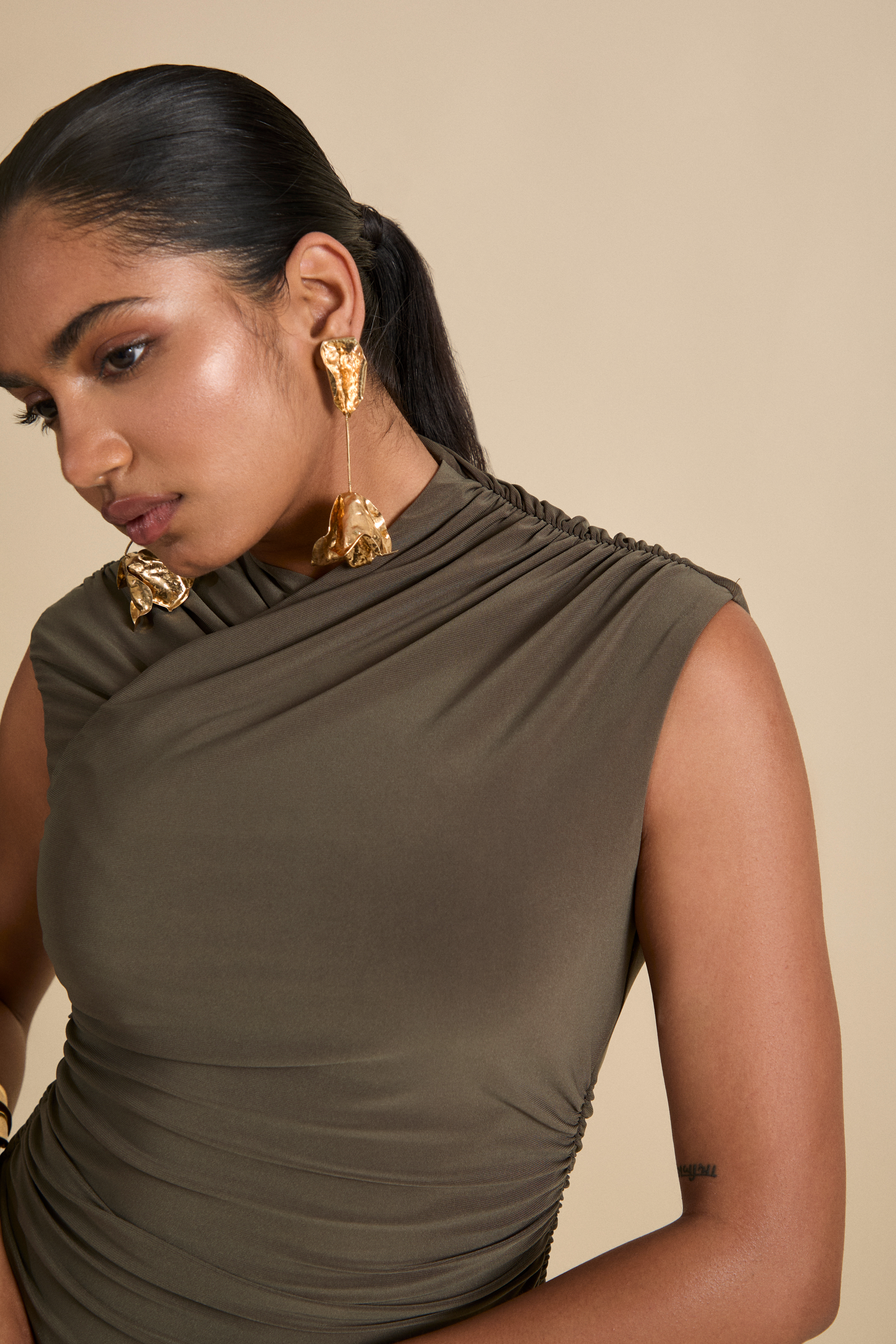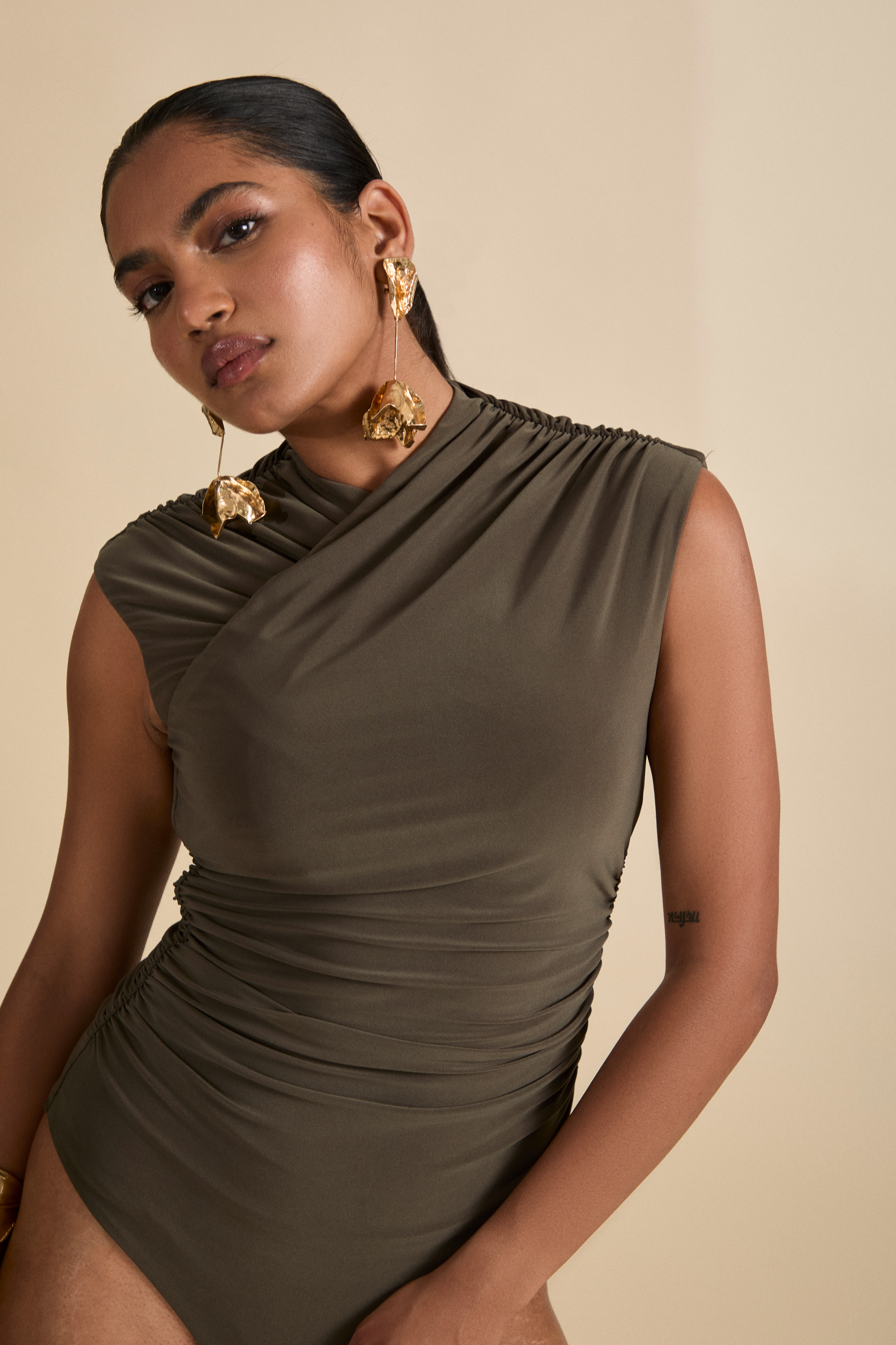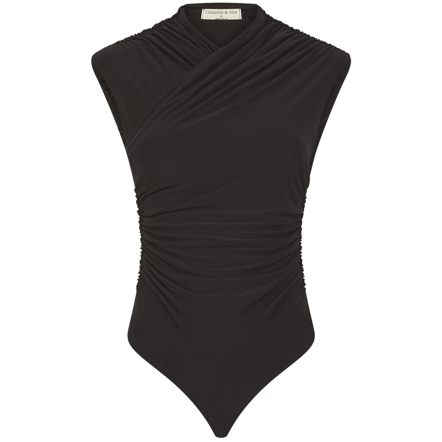 The Azalea Bodysuit, high neck crossover detail with strategically placed ruching on the shoulders and waist to provide the perfect silhouette.