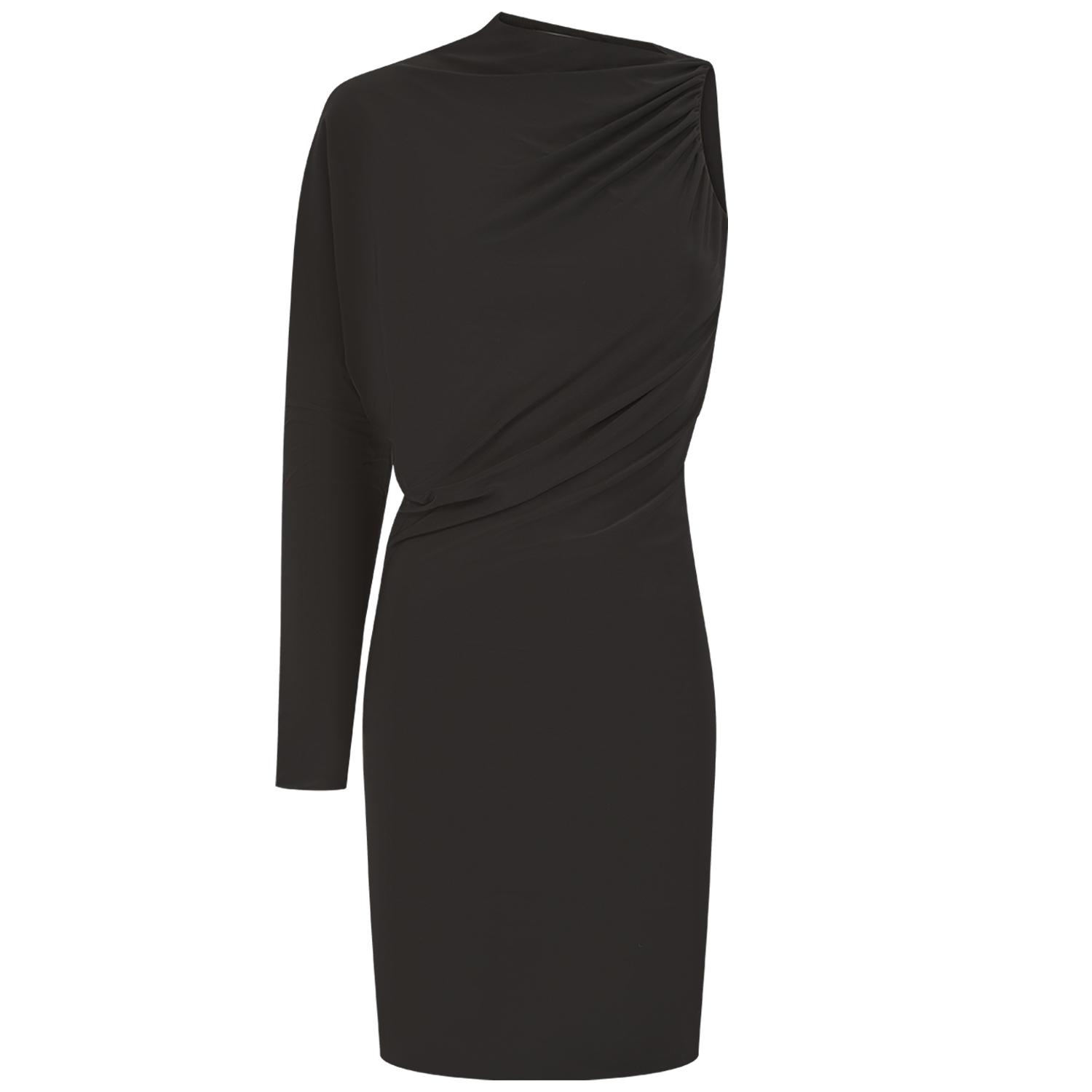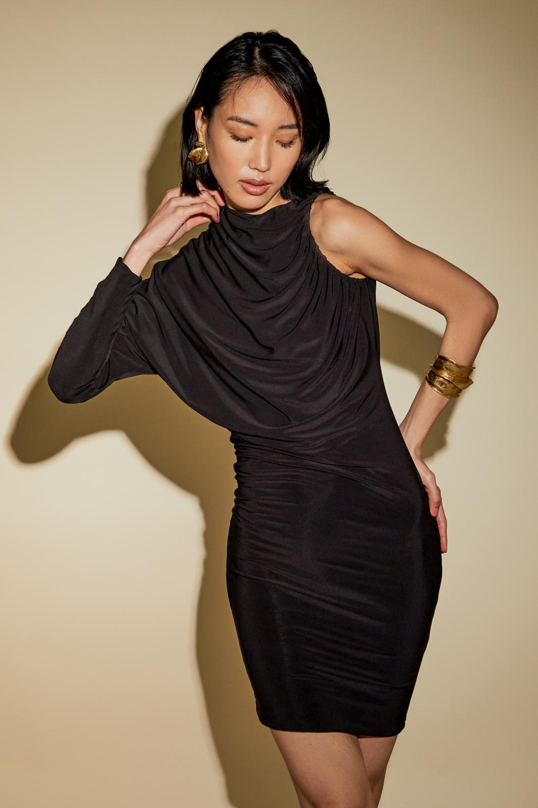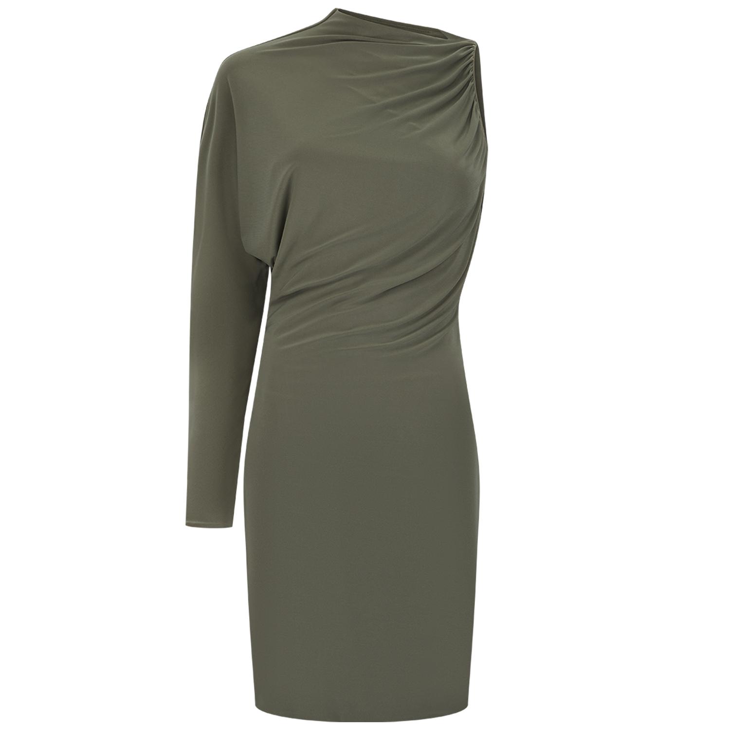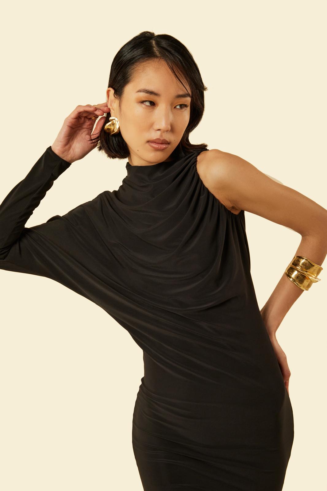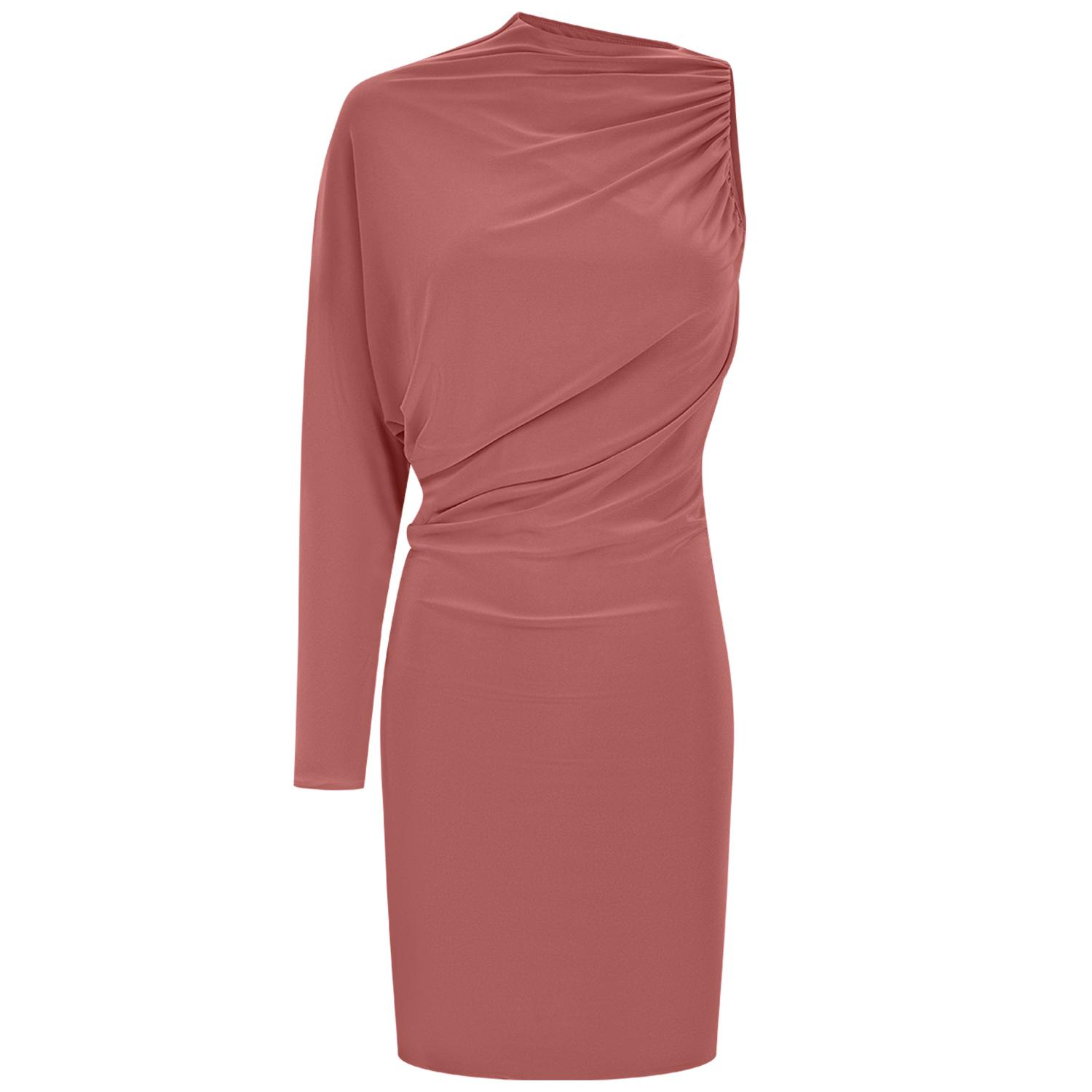 The Belladonna Mini Dress, with a batwing sleeve, asymmetric neckline and ruched shoulder detail culminating in a piece that is both feminine and powerful.