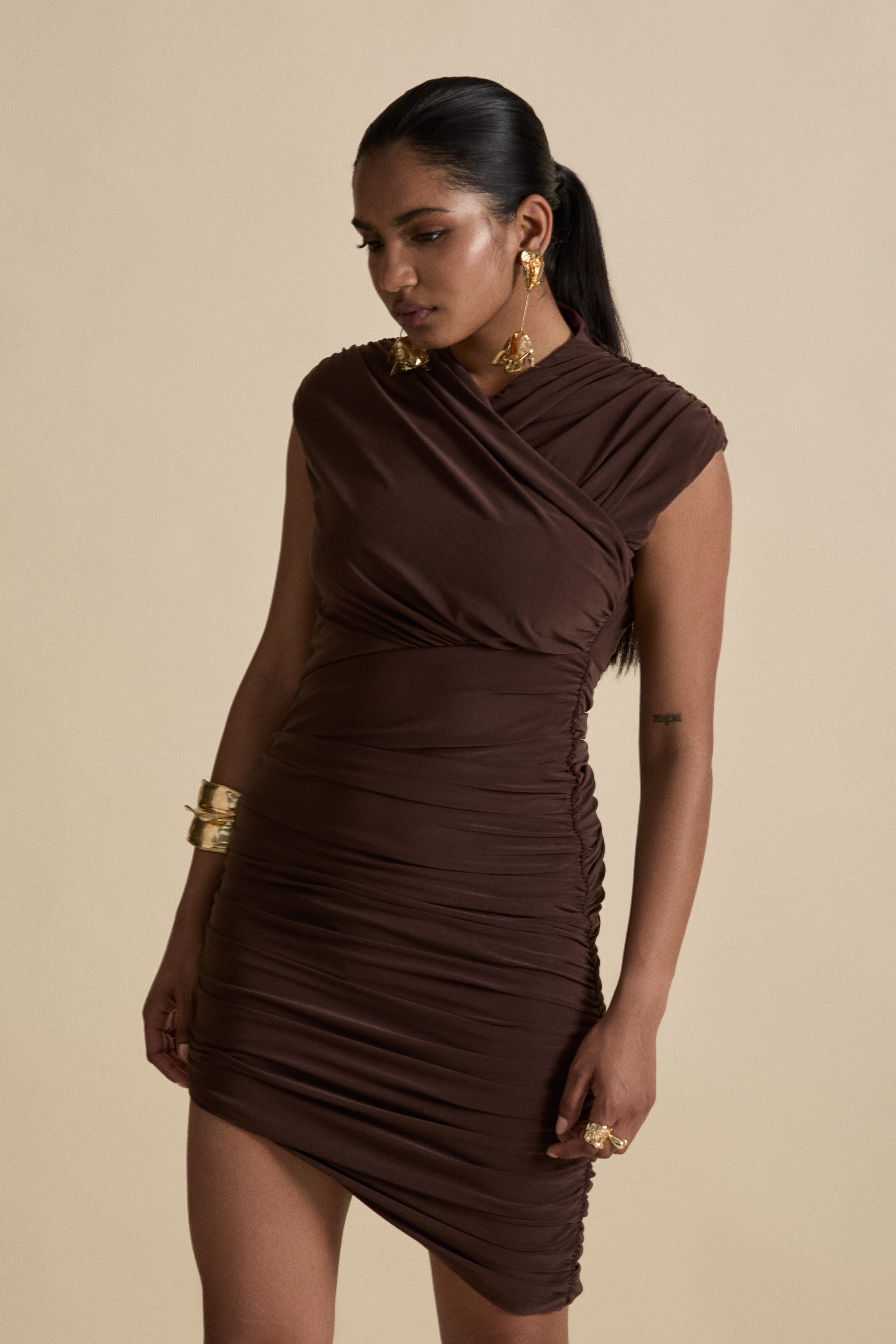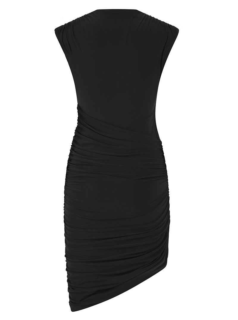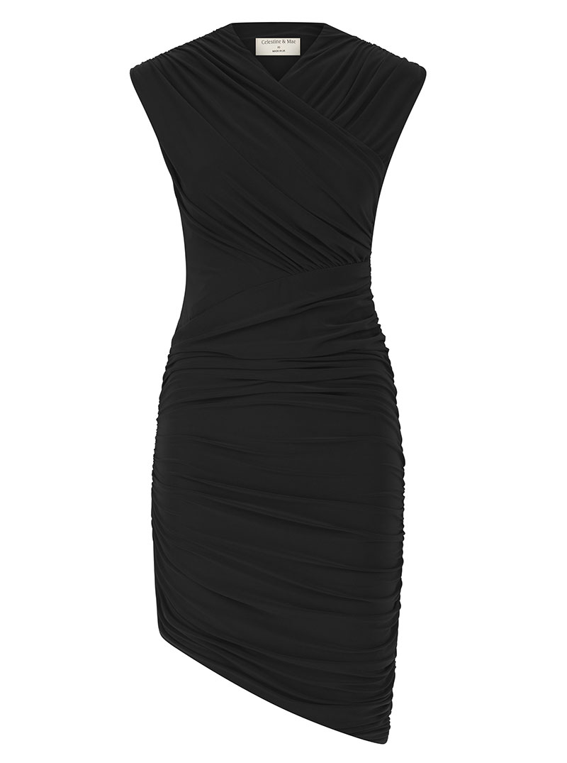 The Calla Mini Dress, exuding sleek and sultry with a stunning wrapover ruched bodice and asymmetric hemline, artfully ruched to flatter.