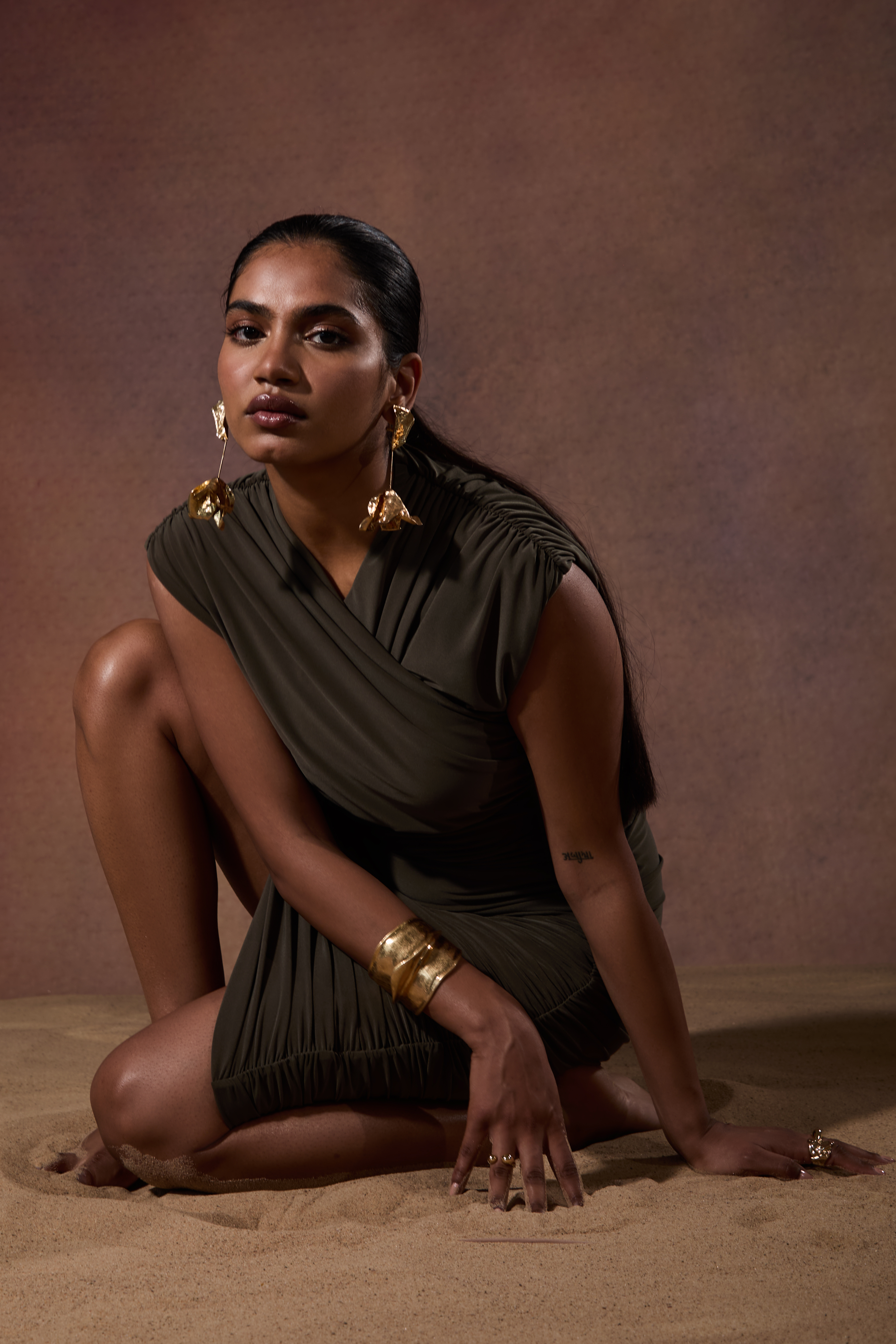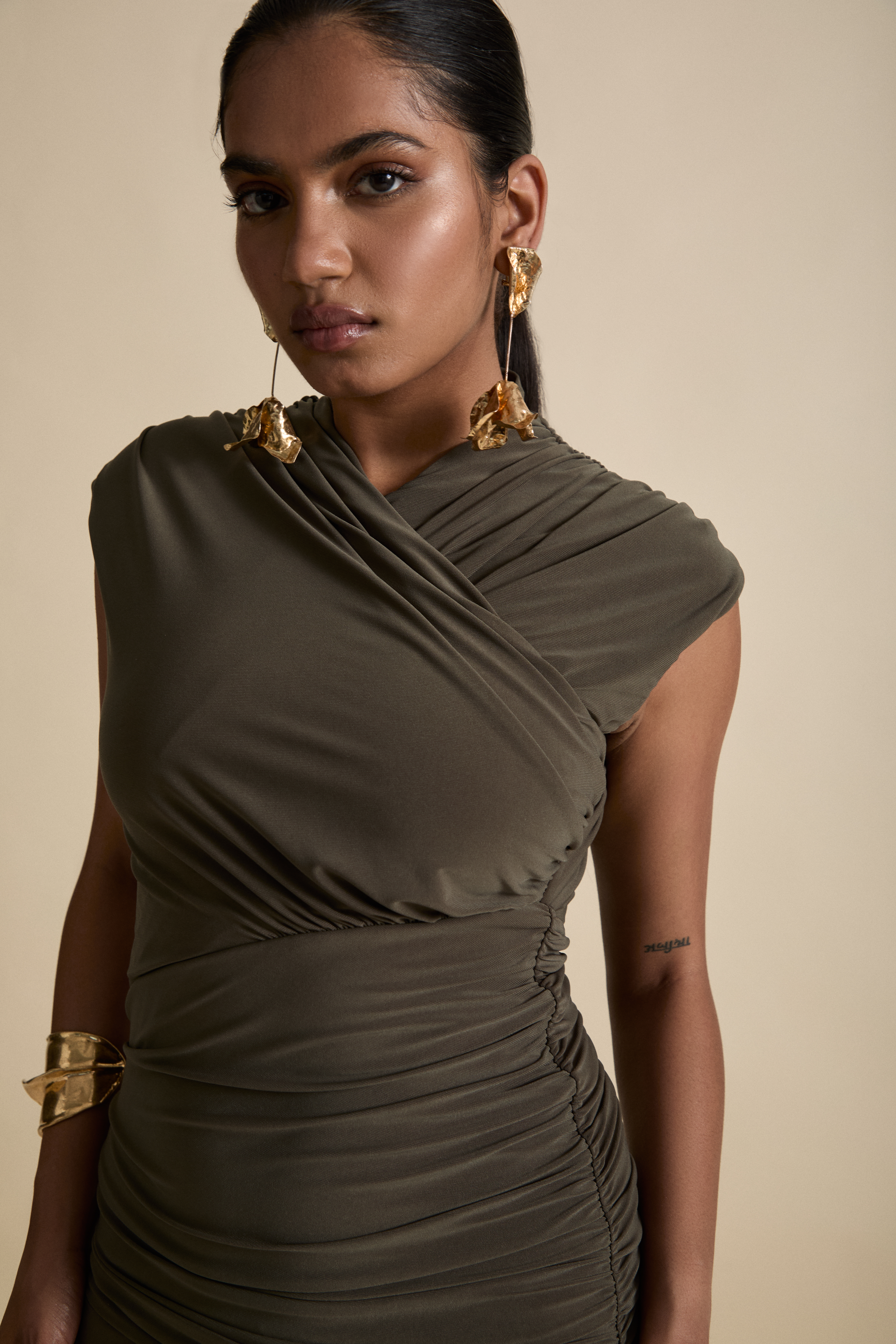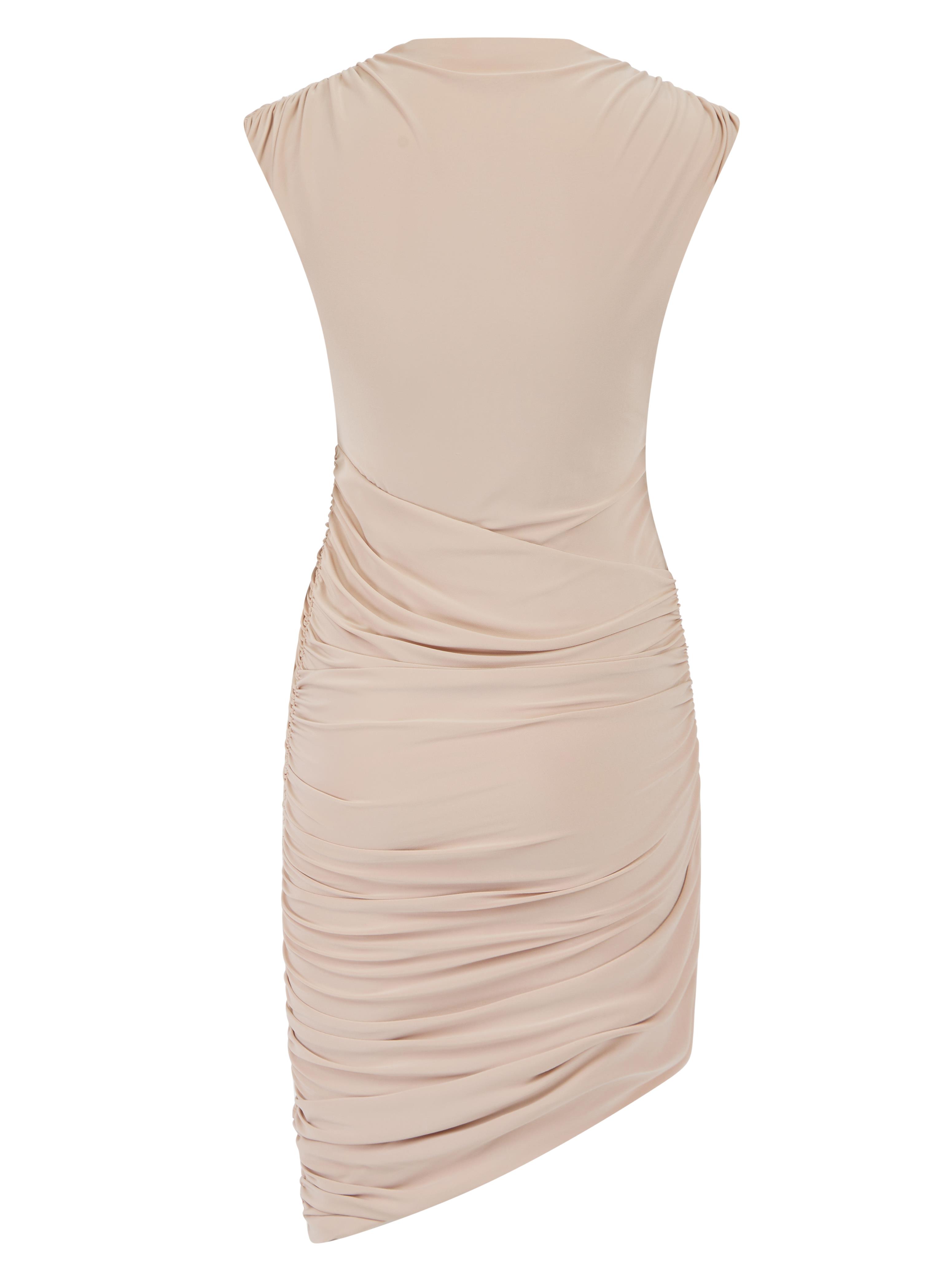 The Calla Mini Dress, exuding sleek and sultry with a stunning wrapover ruched bodice and asymmetric hemline, artfully ruched to flatter.
