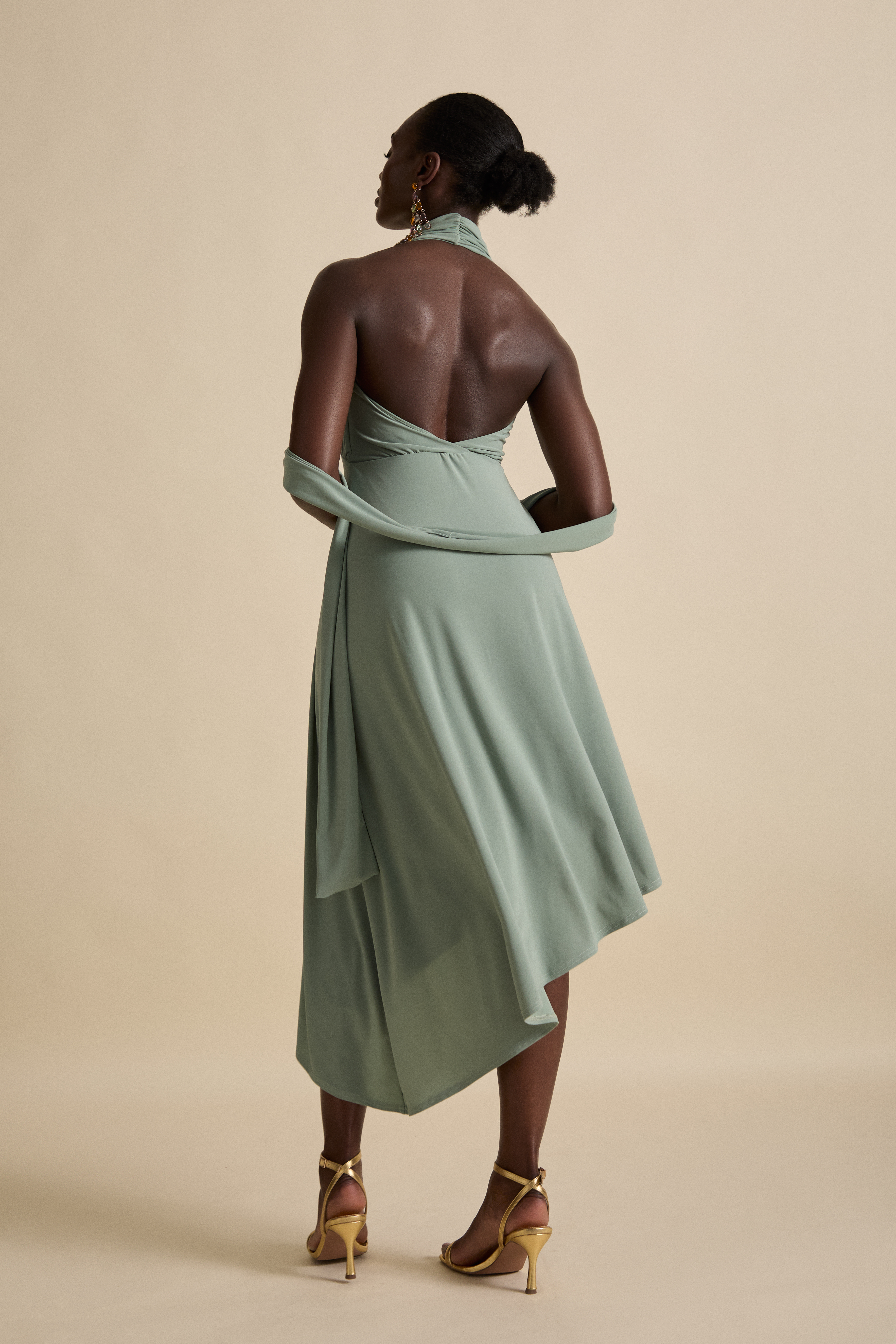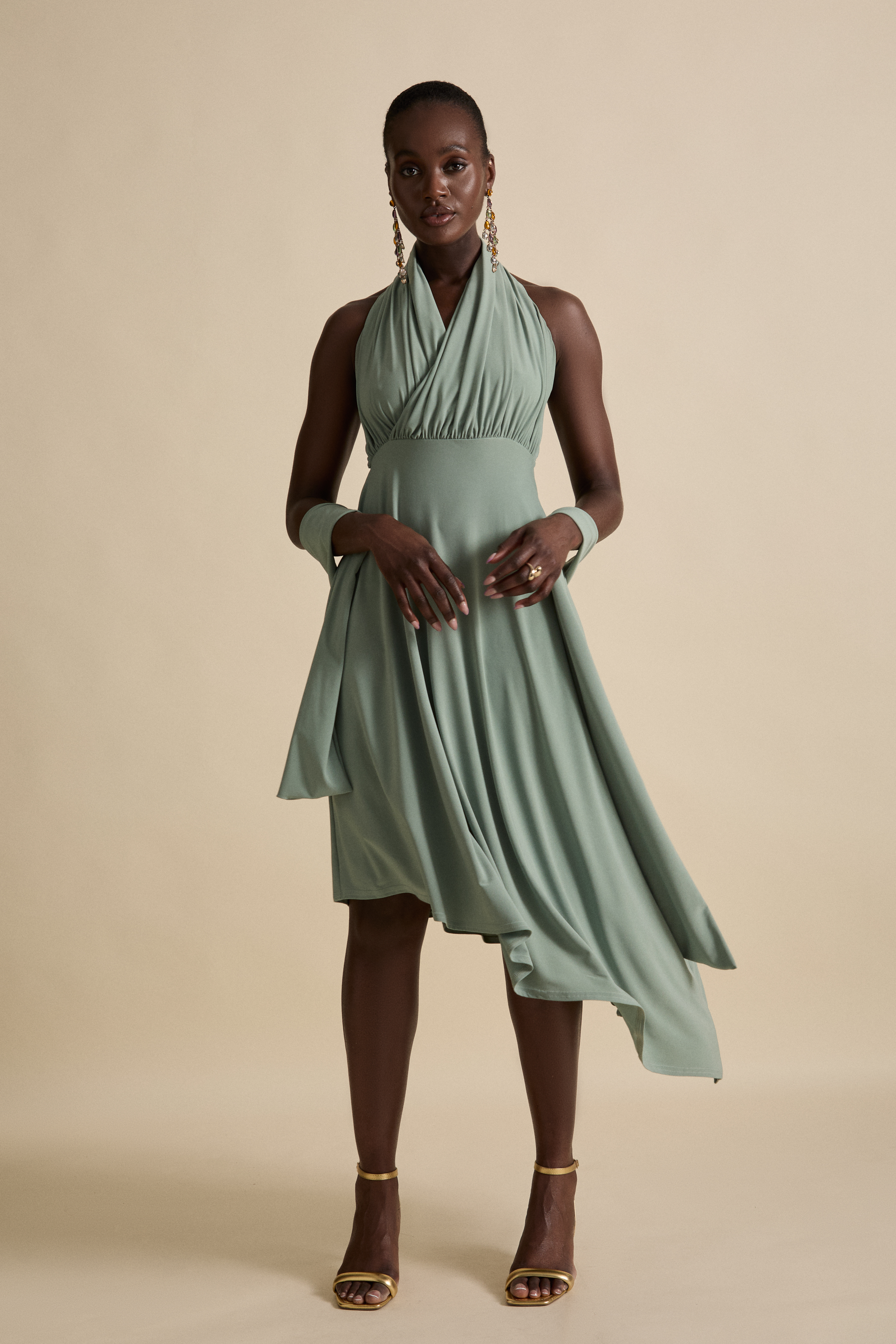 Inspired by elegant summers and beach weddings, this dress is ethereal and defined. Ruching detail to the bust and a flowing asymmetric skirt, finished with a scarf that is inspired by the dupatta or Chunni, a subtle homage to our Punjabi heritage.