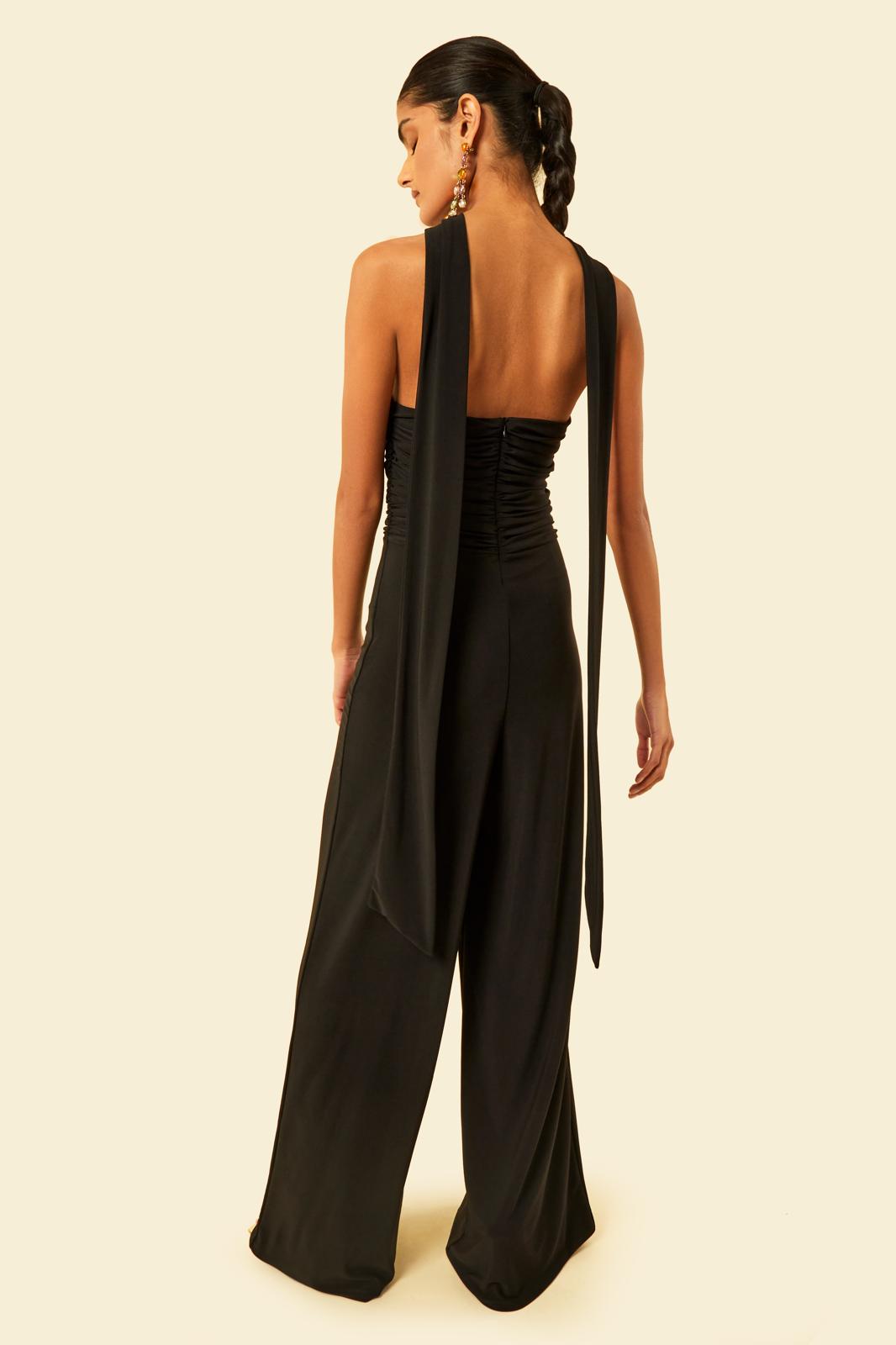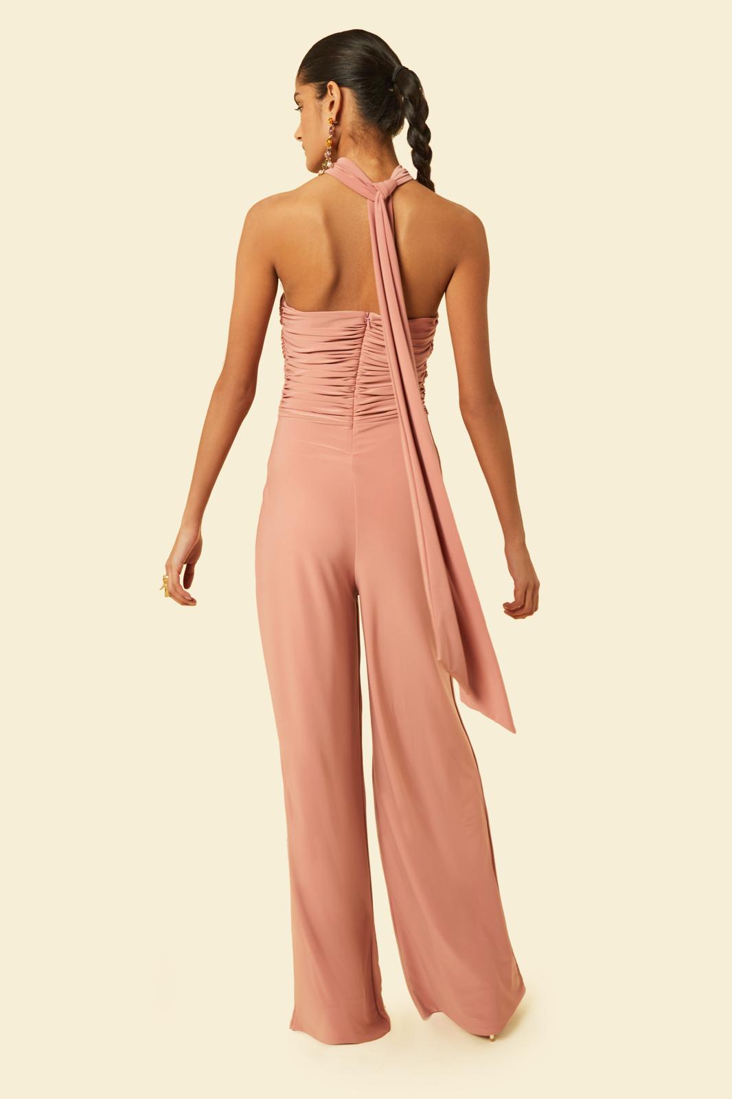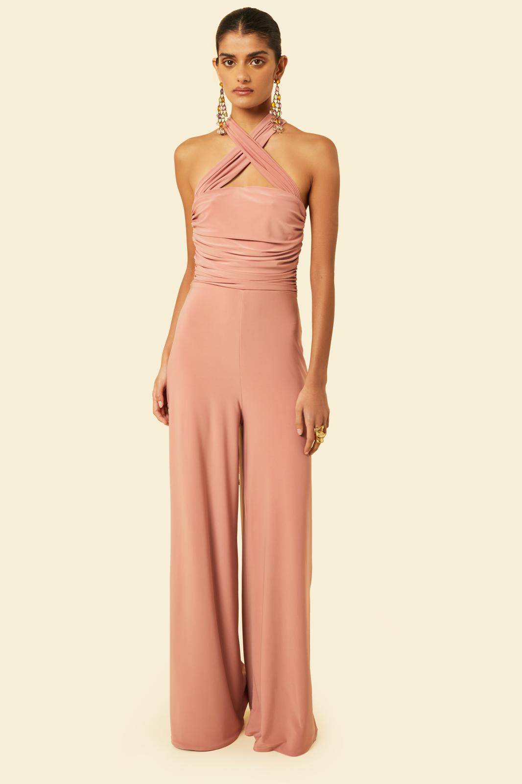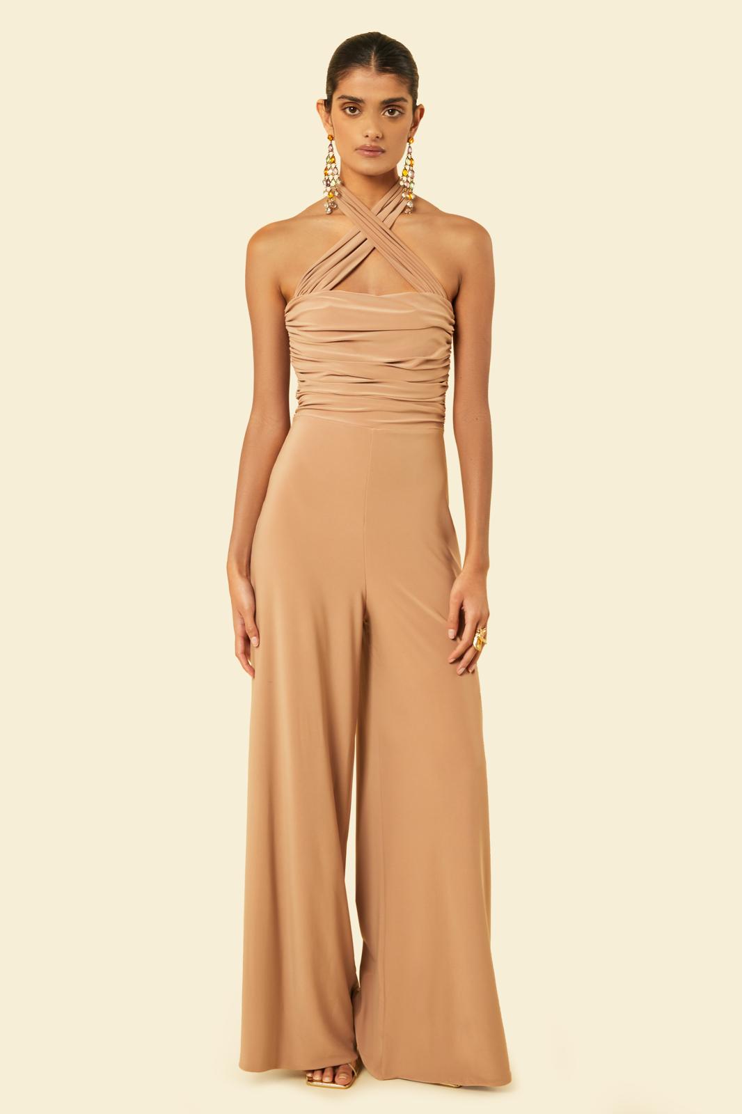The Kahili Jumpsuit, with strategically ruched bodice detailing, wide leg trouser and crossover halterneck detail. This jumpsuit exudes effortless luxury.