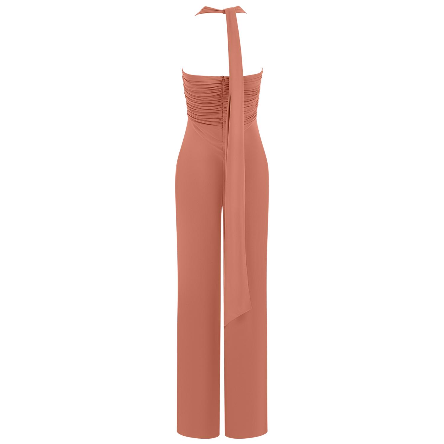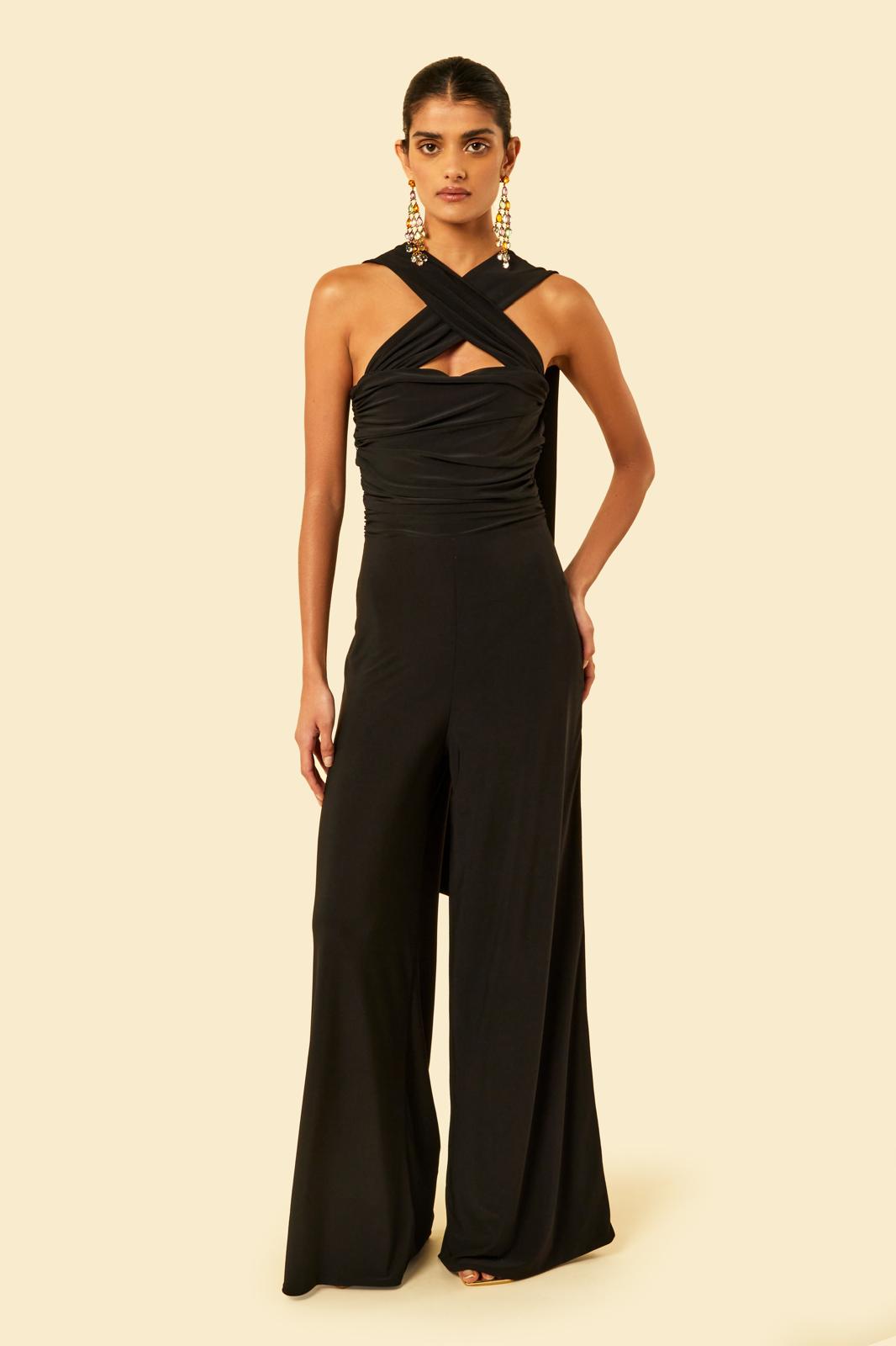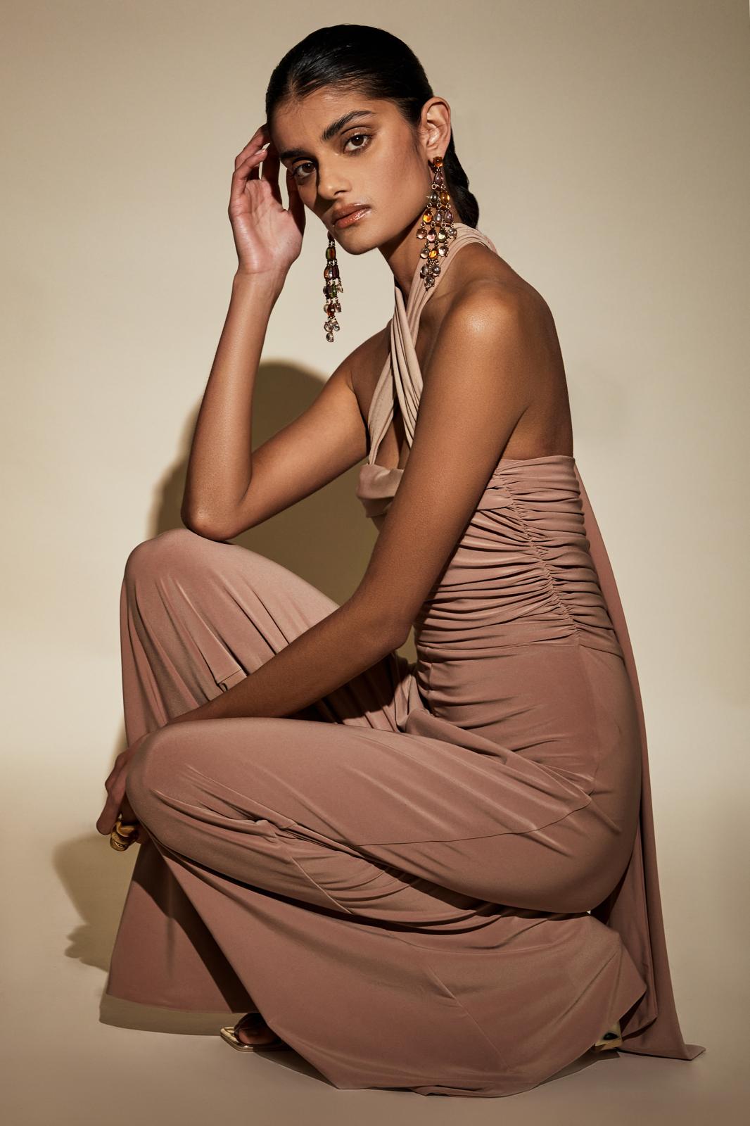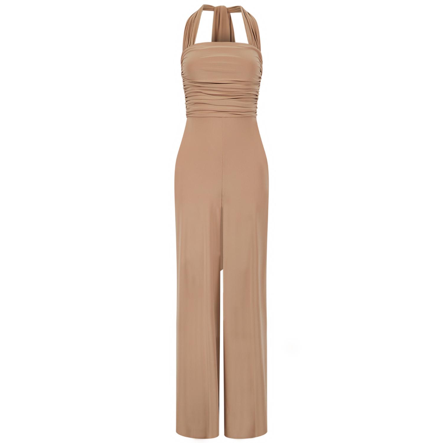 The Kahili Jumpsuit, with strategically ruched bodice detailing, wide leg trouser and crossover halterneck detail. This jumpsuit exudes effortless luxury.
