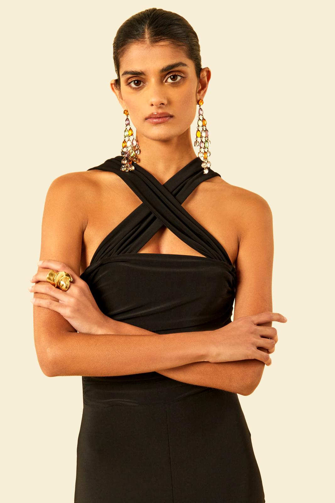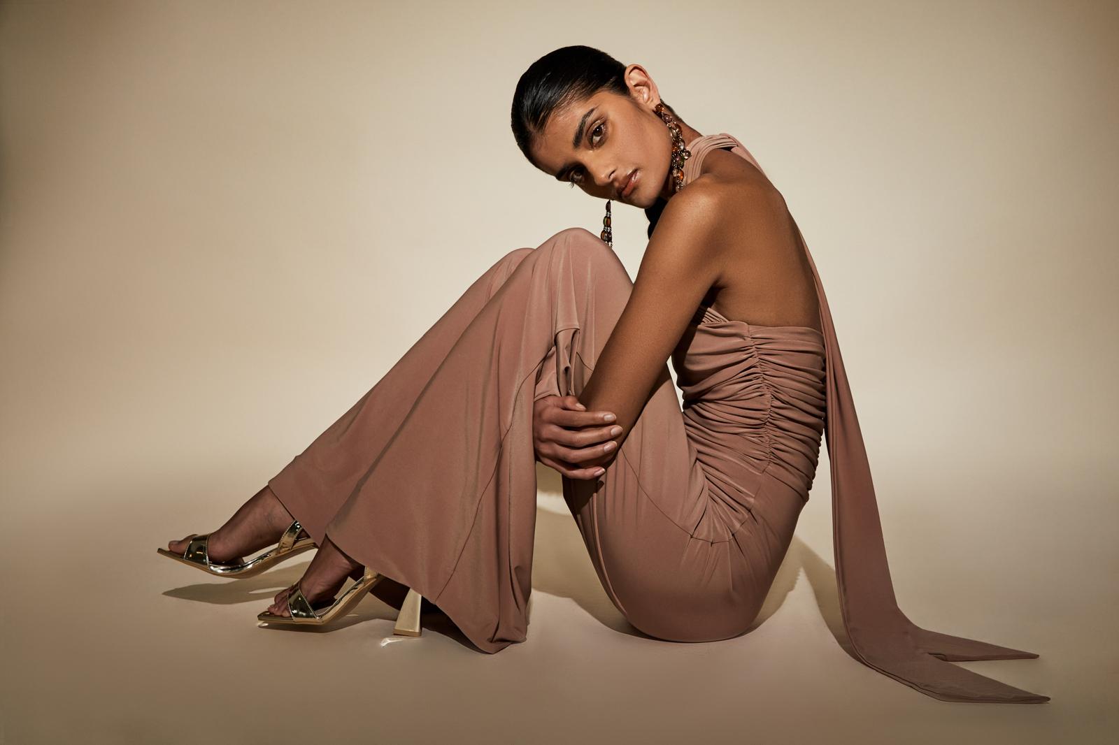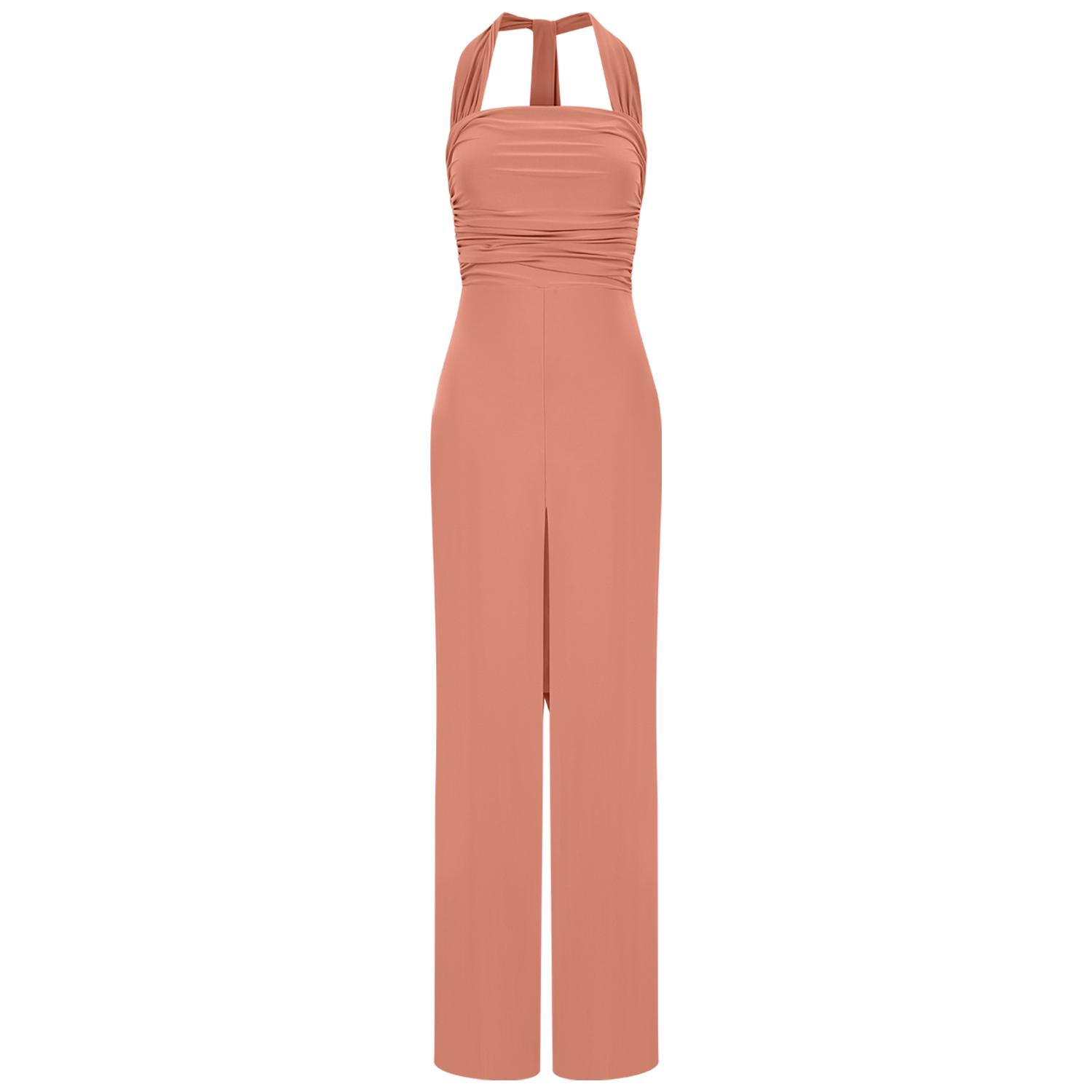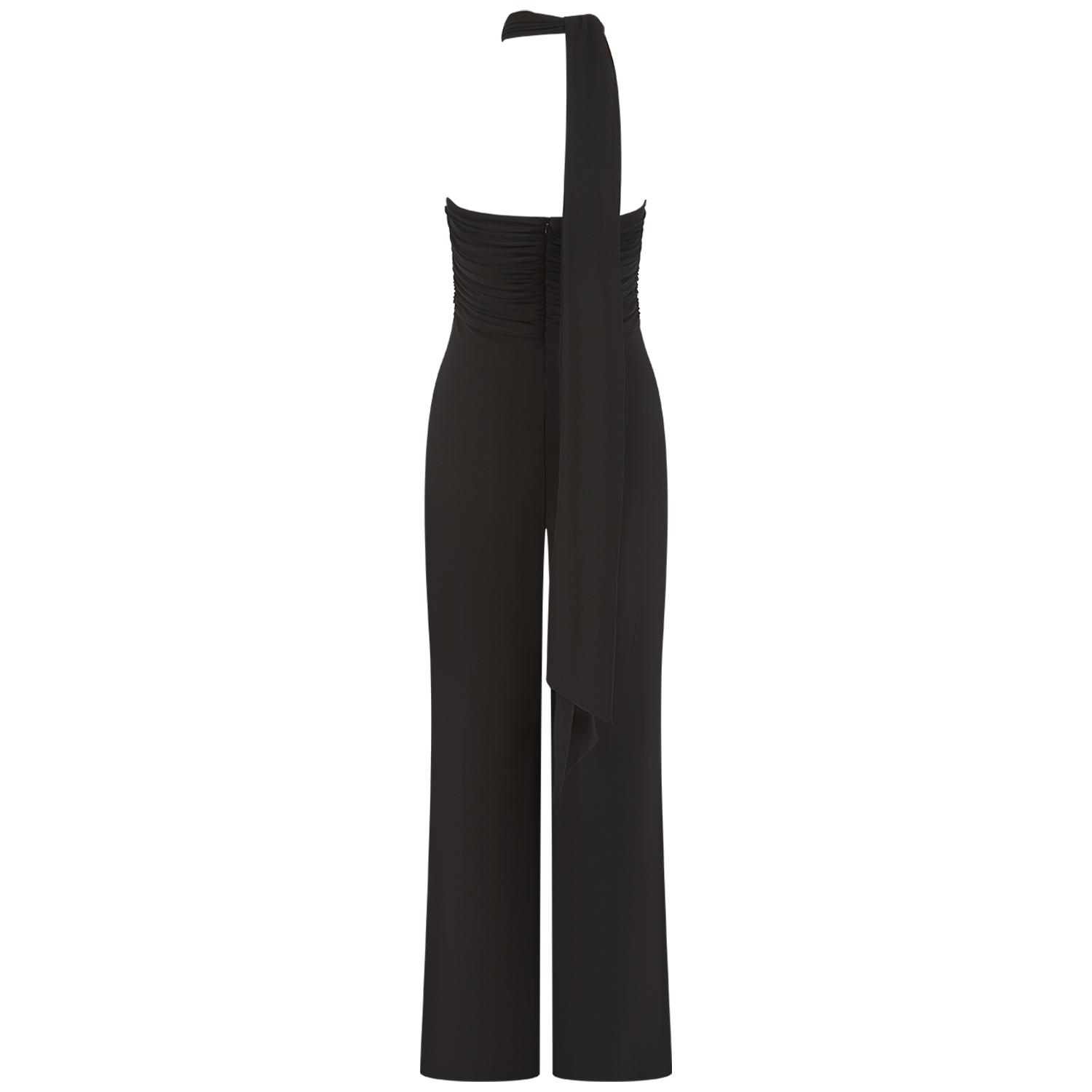 The Kahili Jumpsuit, with strategically ruched bodice detailing, wide leg trouser and crossover halterneck detail. This jumpsuit exudes effortless luxury.