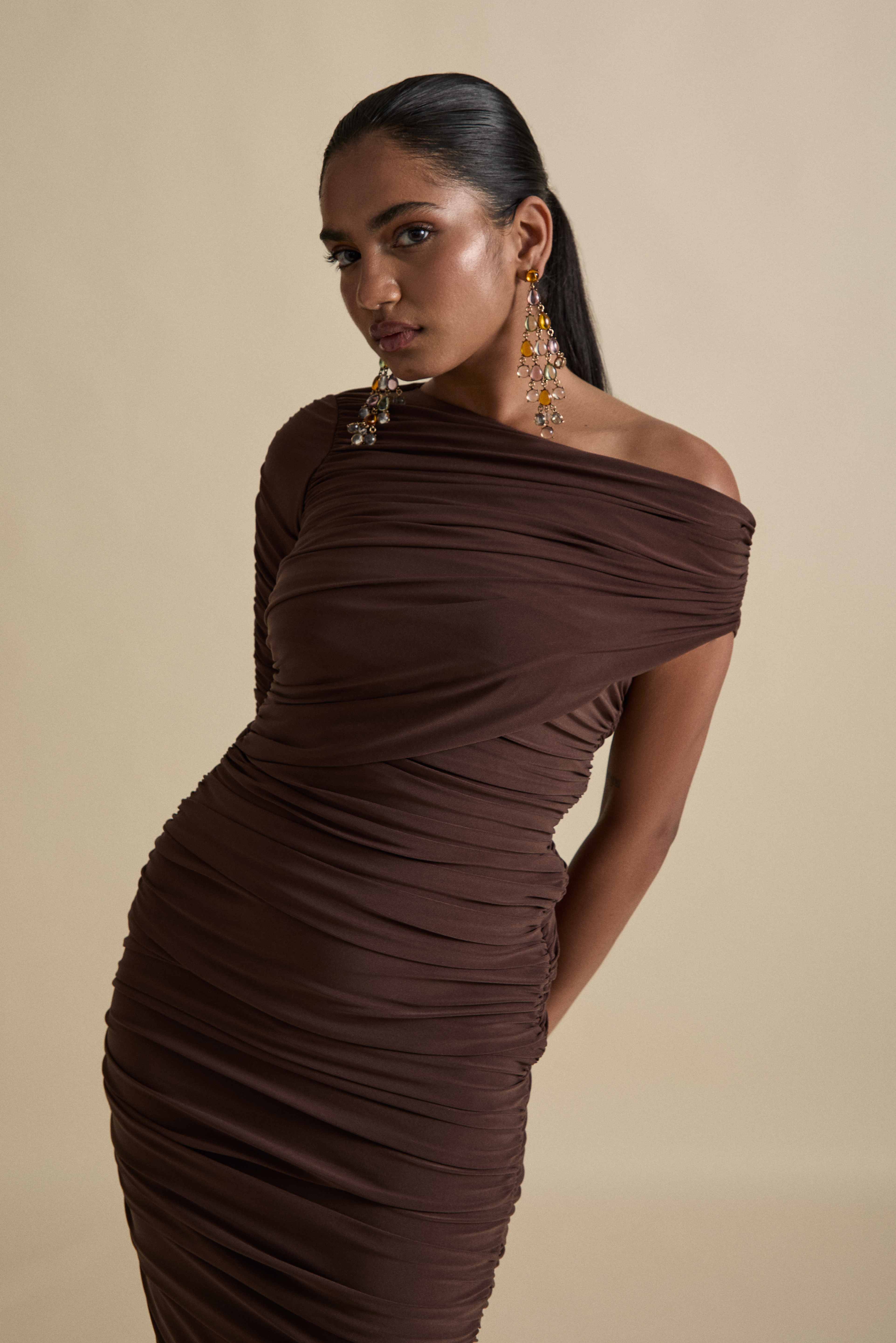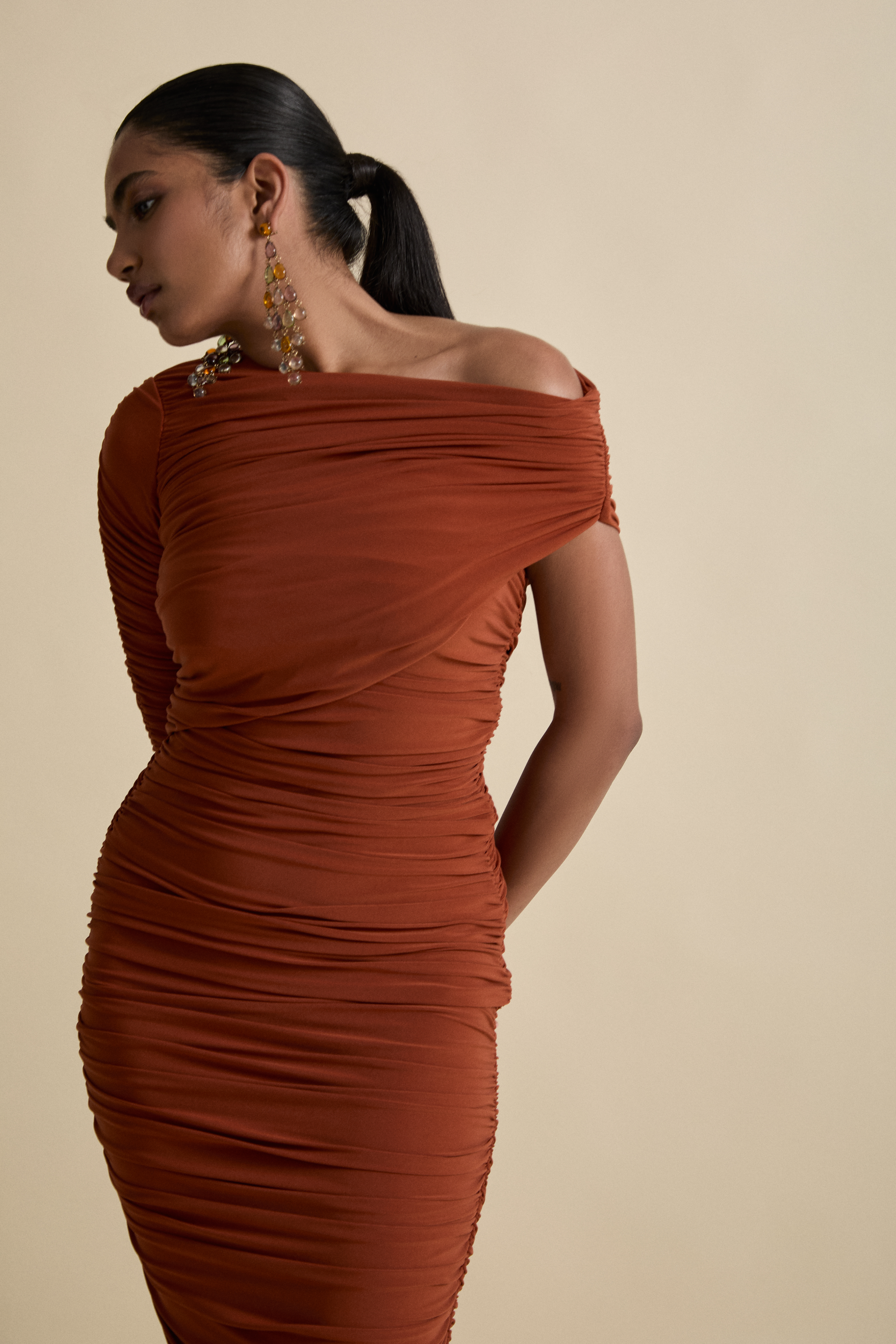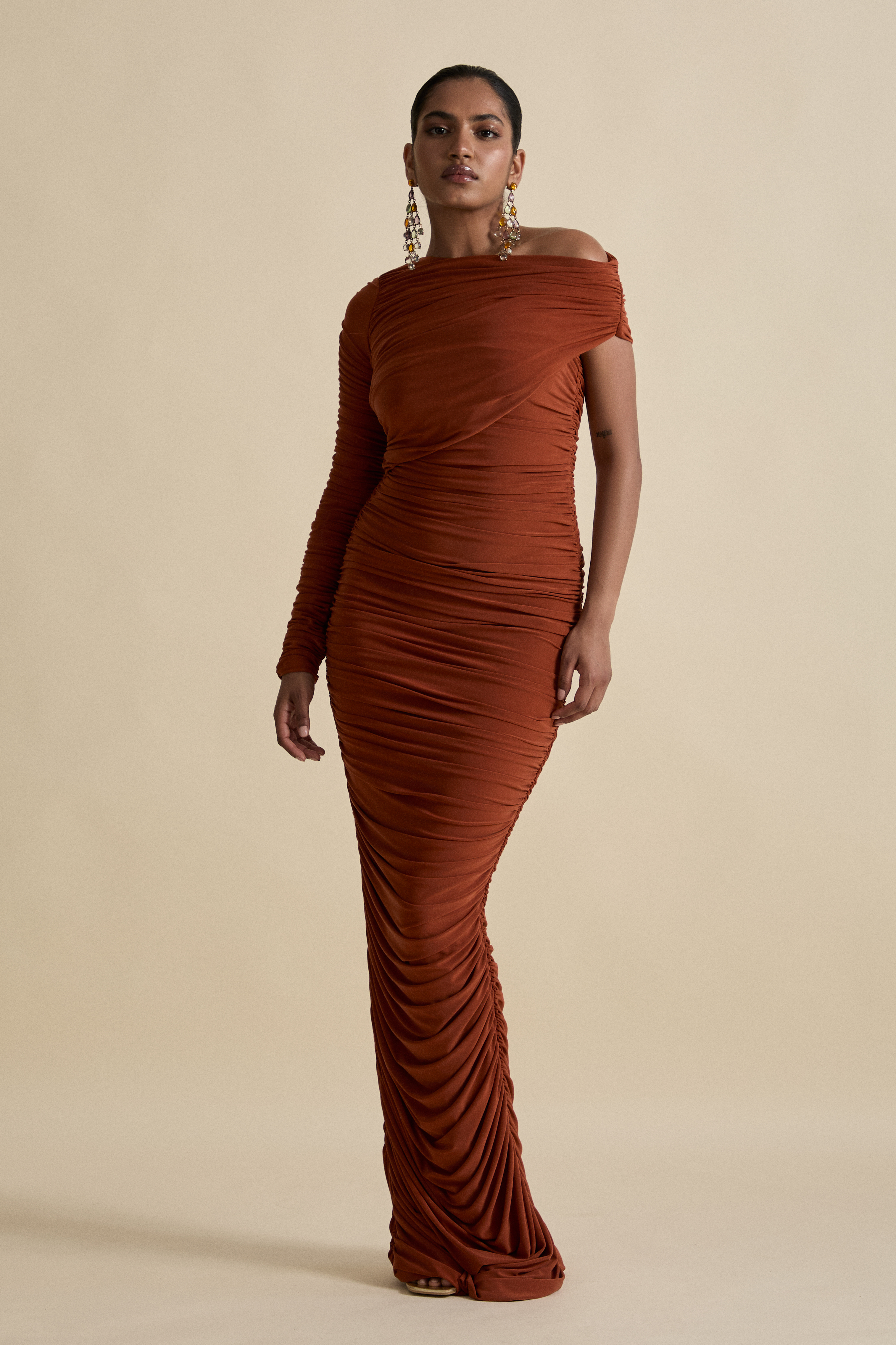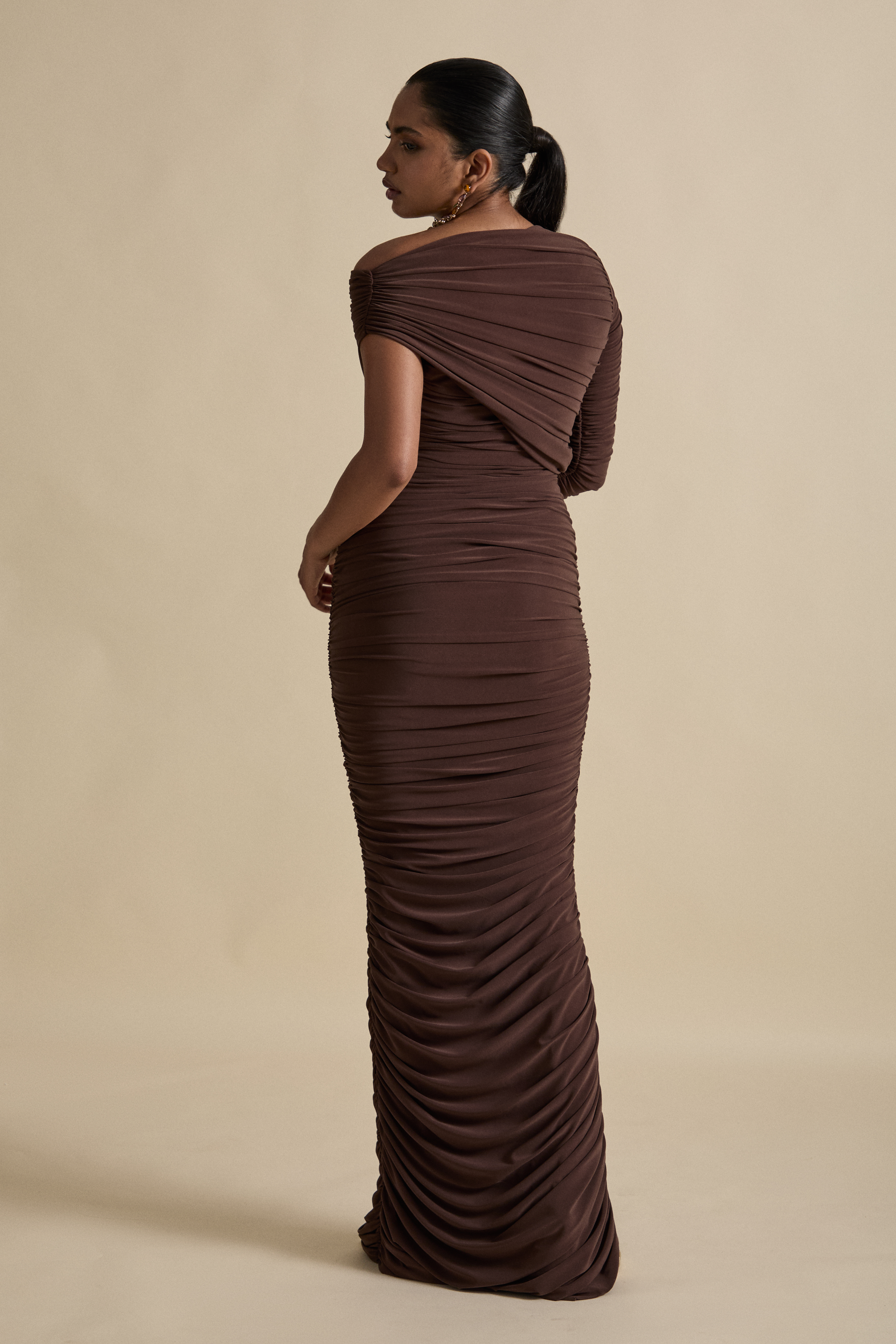 Our most awaited occasion piece, a year of work and a labour of love creates this ruched off the shoulder design. Make a statement in this floor sweeping bodycon dress, finished like a piece of art.