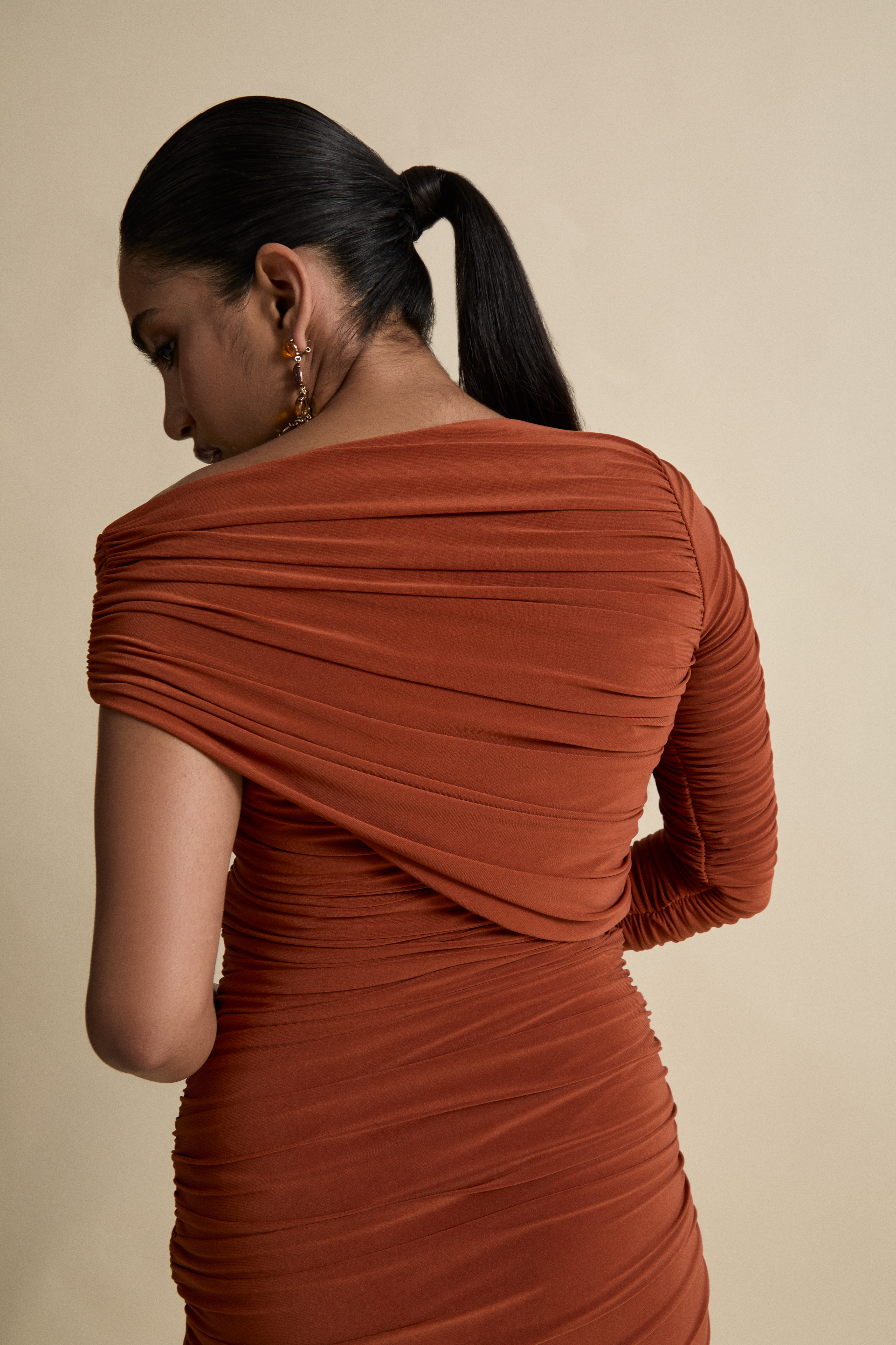 Constructed in locally sourced, premium stretch drape jersey for defined luxury eveningwear.
