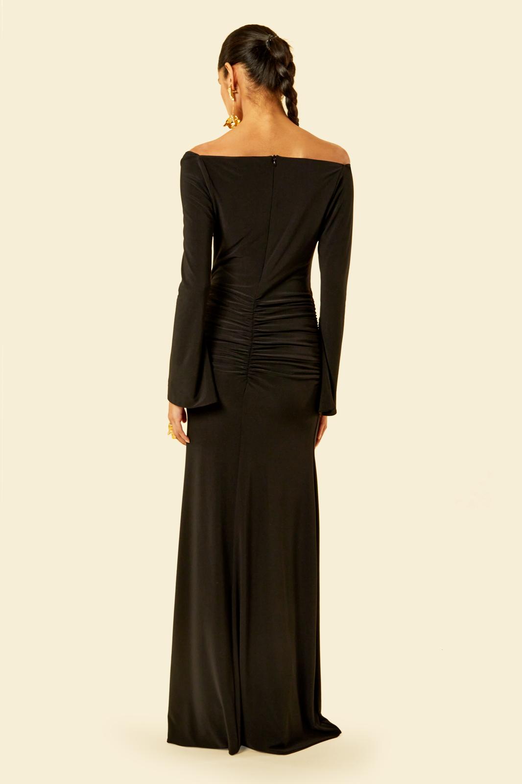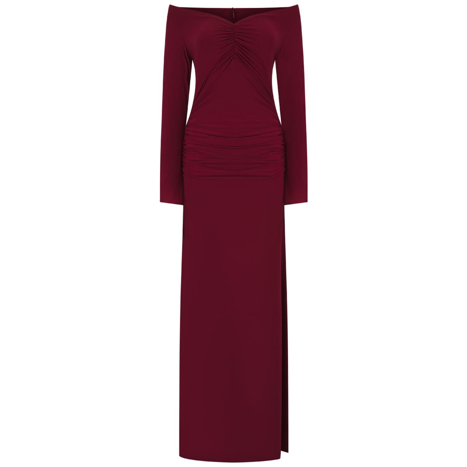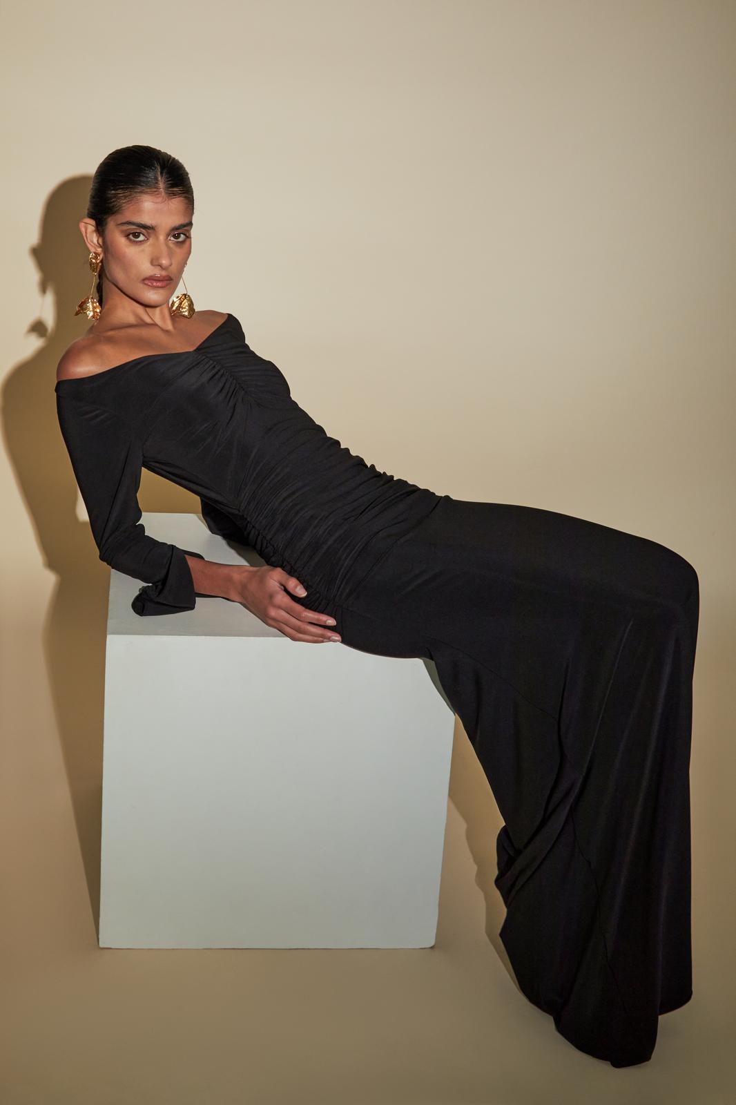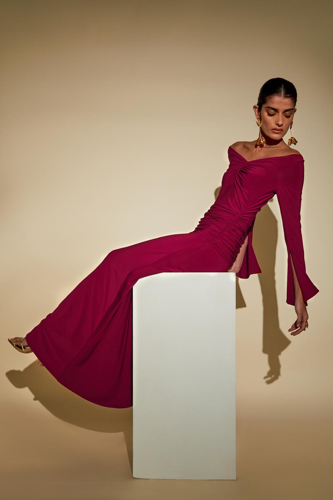 The Maldau Maxi Dress, off the shoulder neckline with intricate ruching details to flatter your figure in all the right places and finished with a discreet slit detail to the arm.