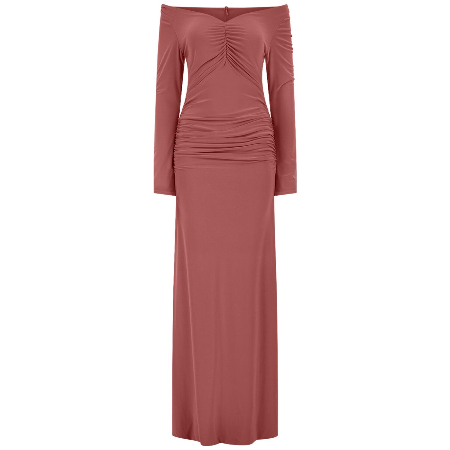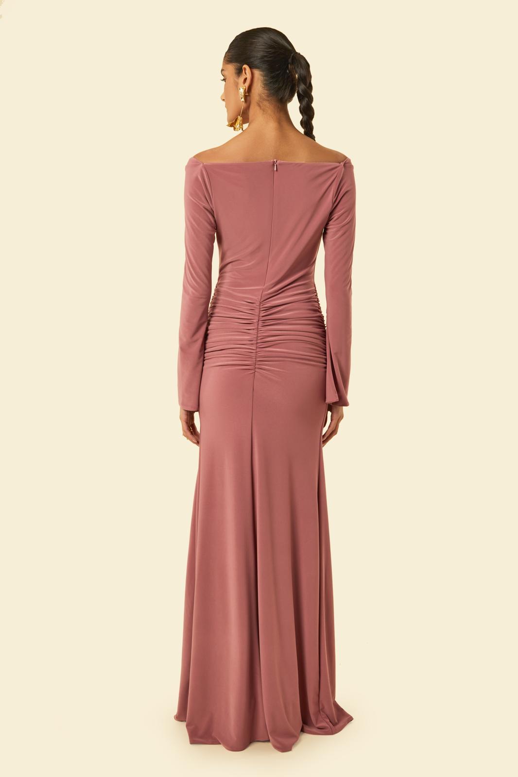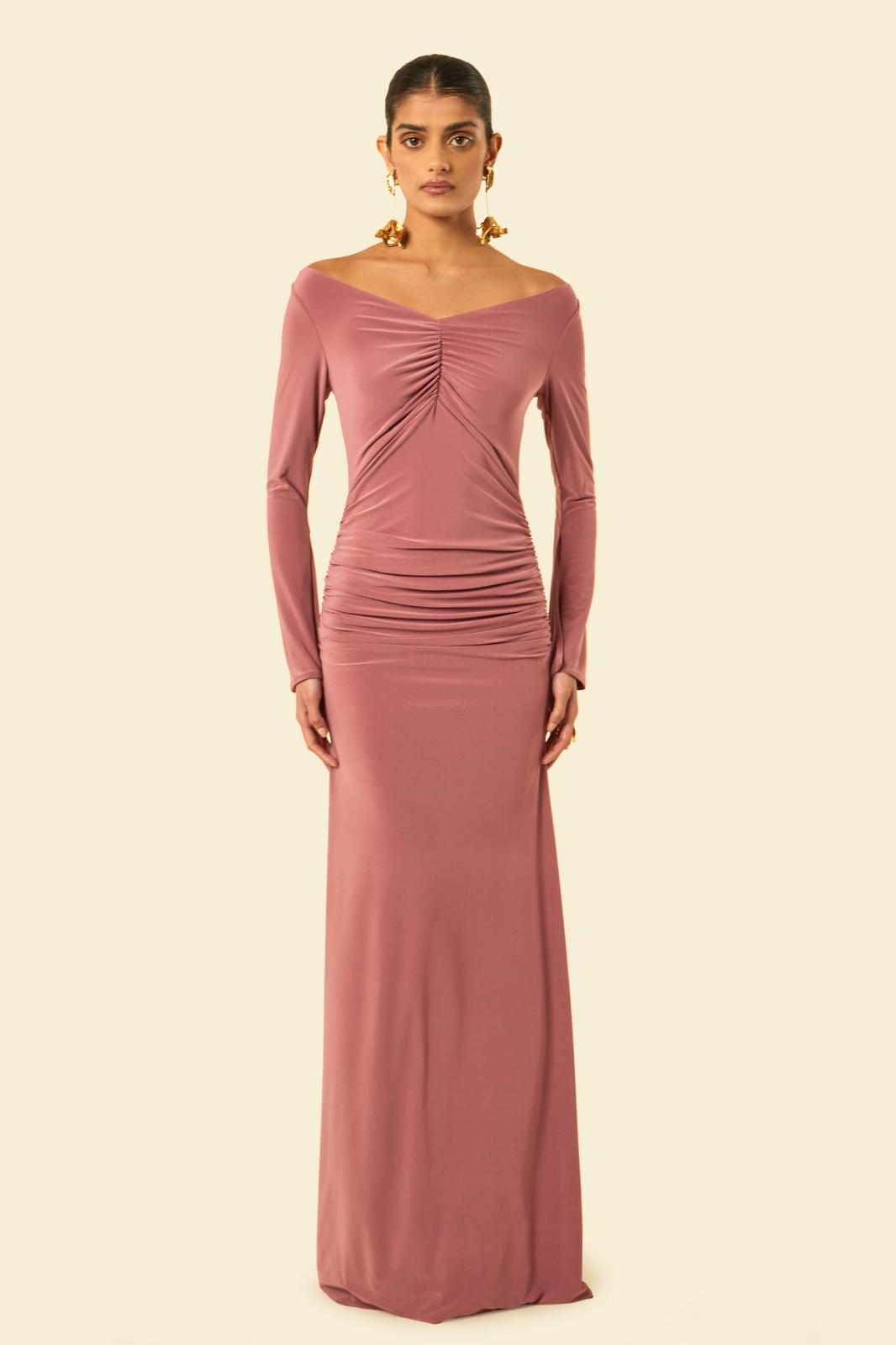 The Maldau Maxi Dress, off the shoulder neckline with intricate ruching details to flatter your figure in all the right places and finished with a discreet slit detail to the arm.