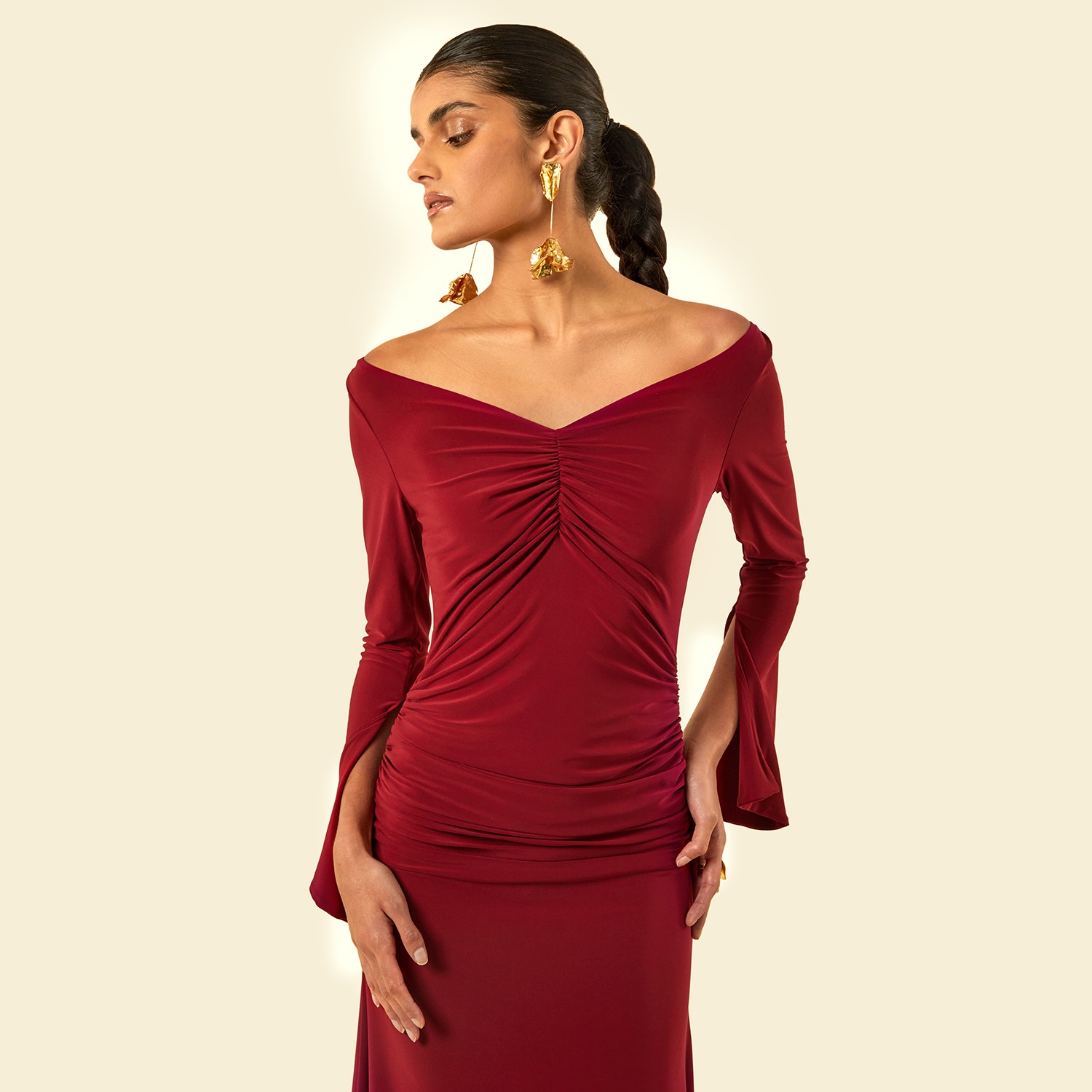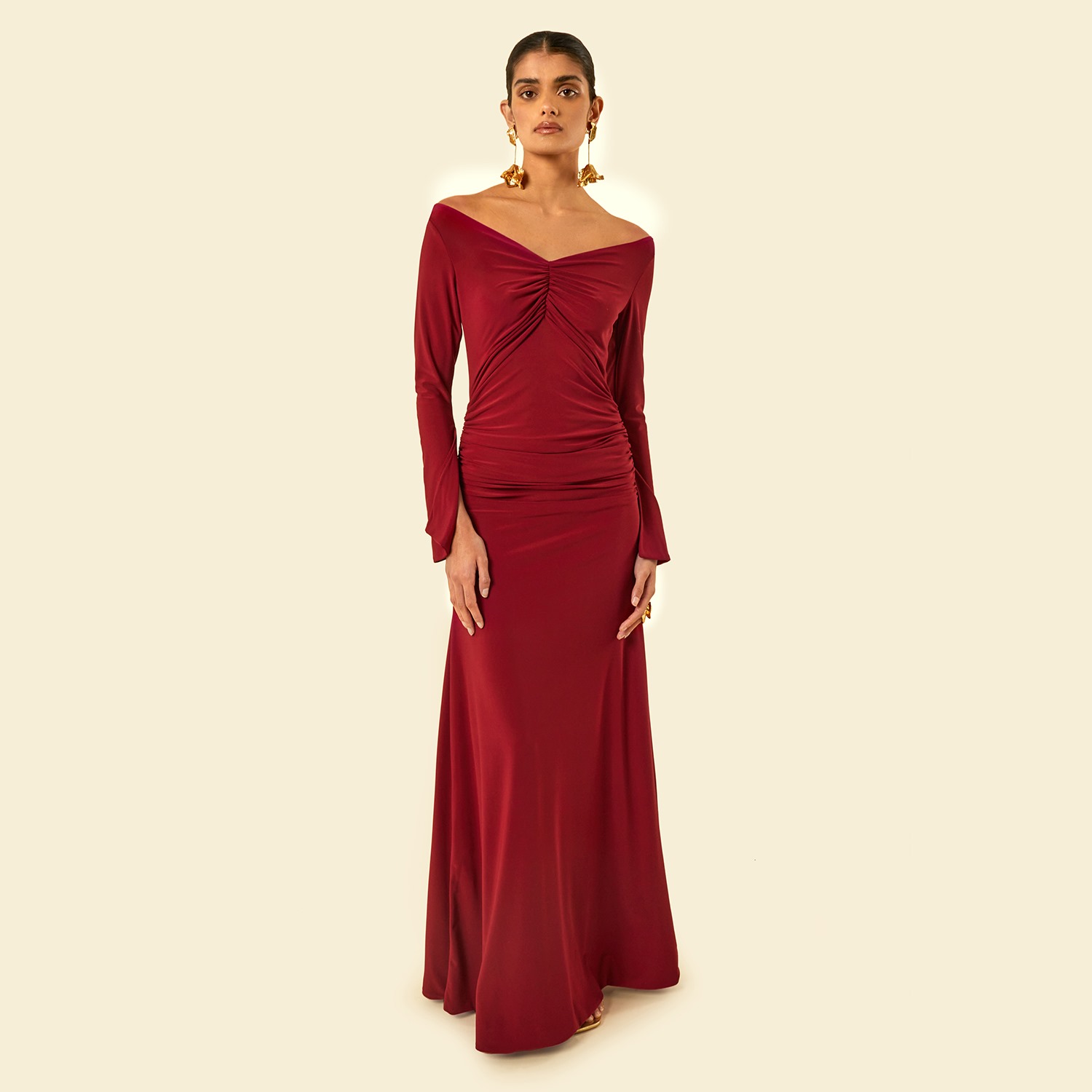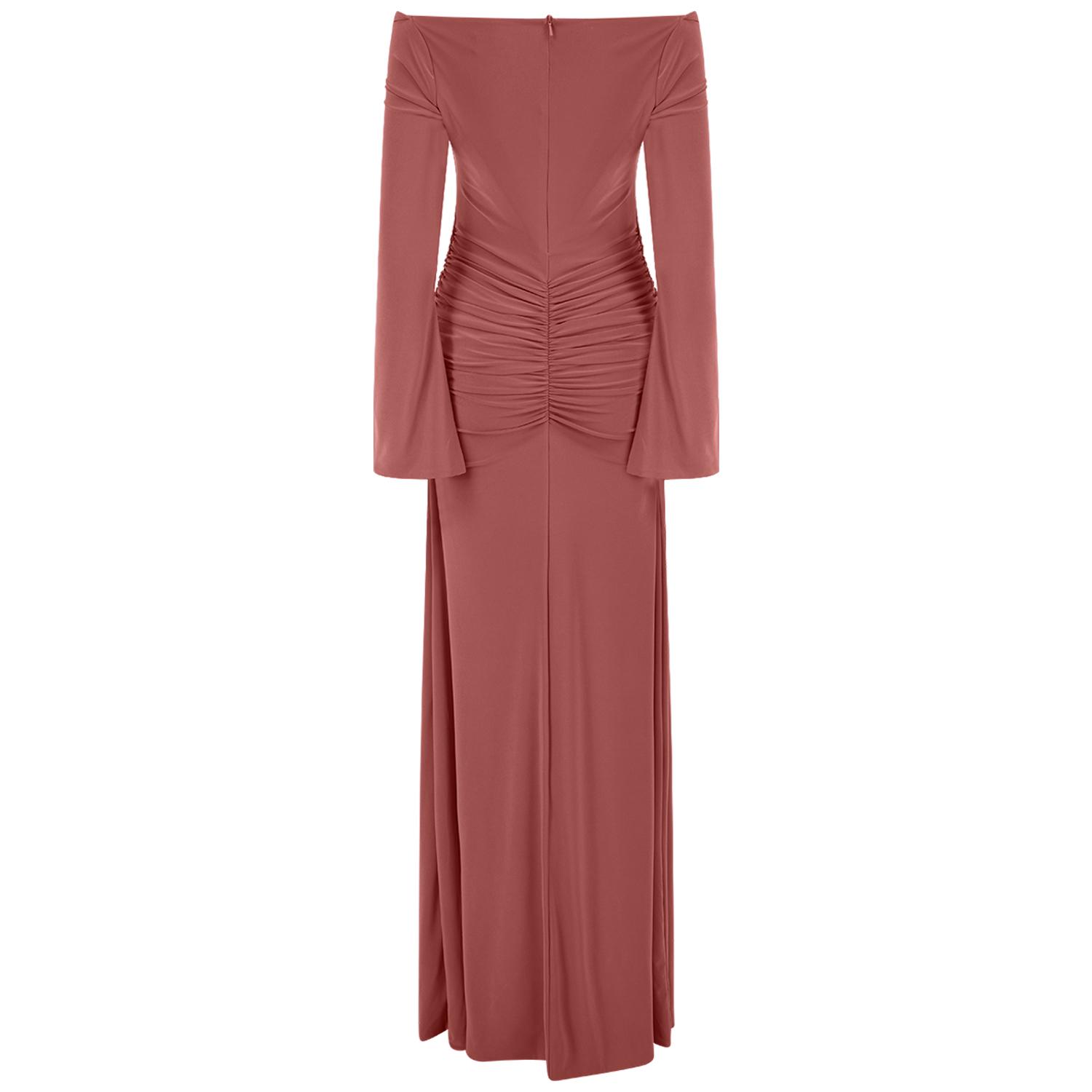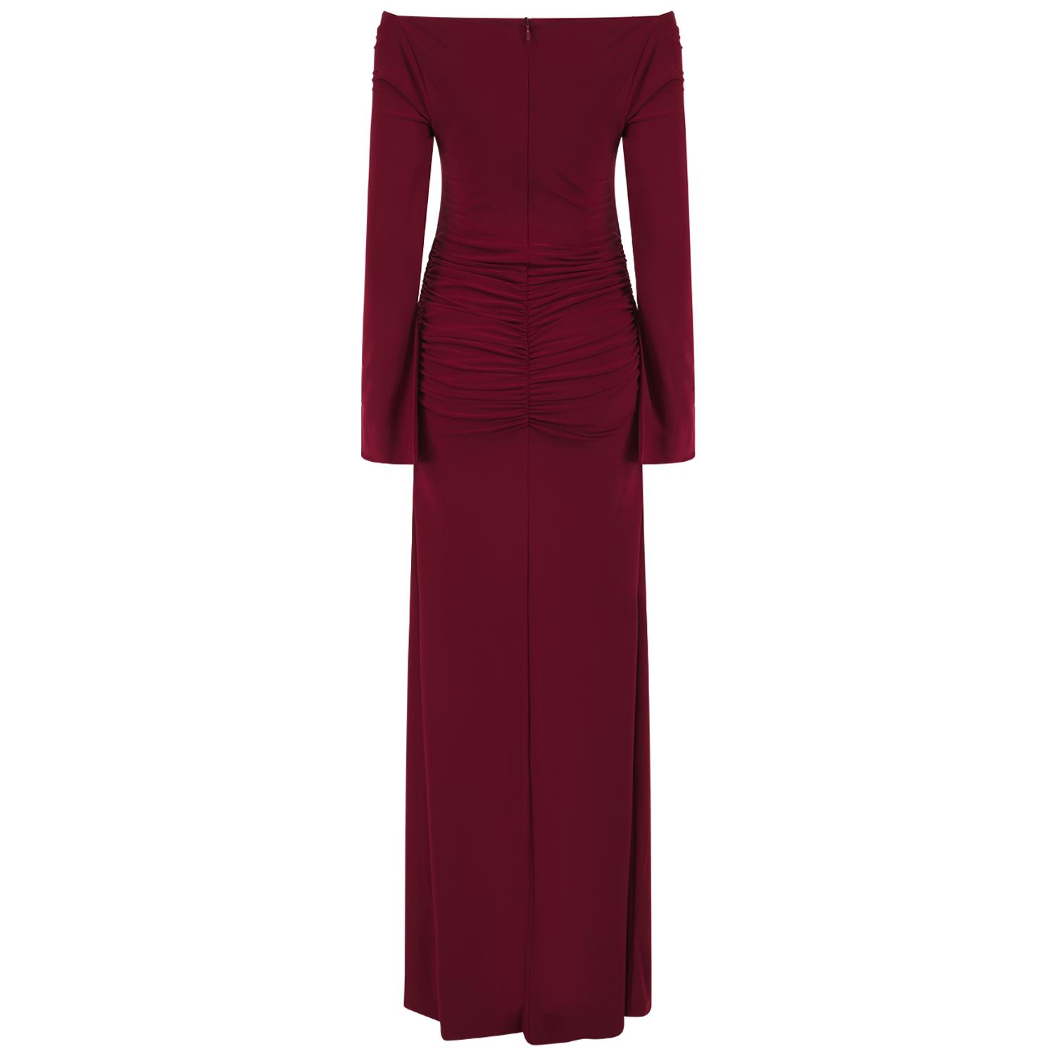 The Maldau Maxi Dress, off the shoulder neckline with intricate ruching details to flatter your figure in all the right places and finished with a discreet slit detail to the arm.