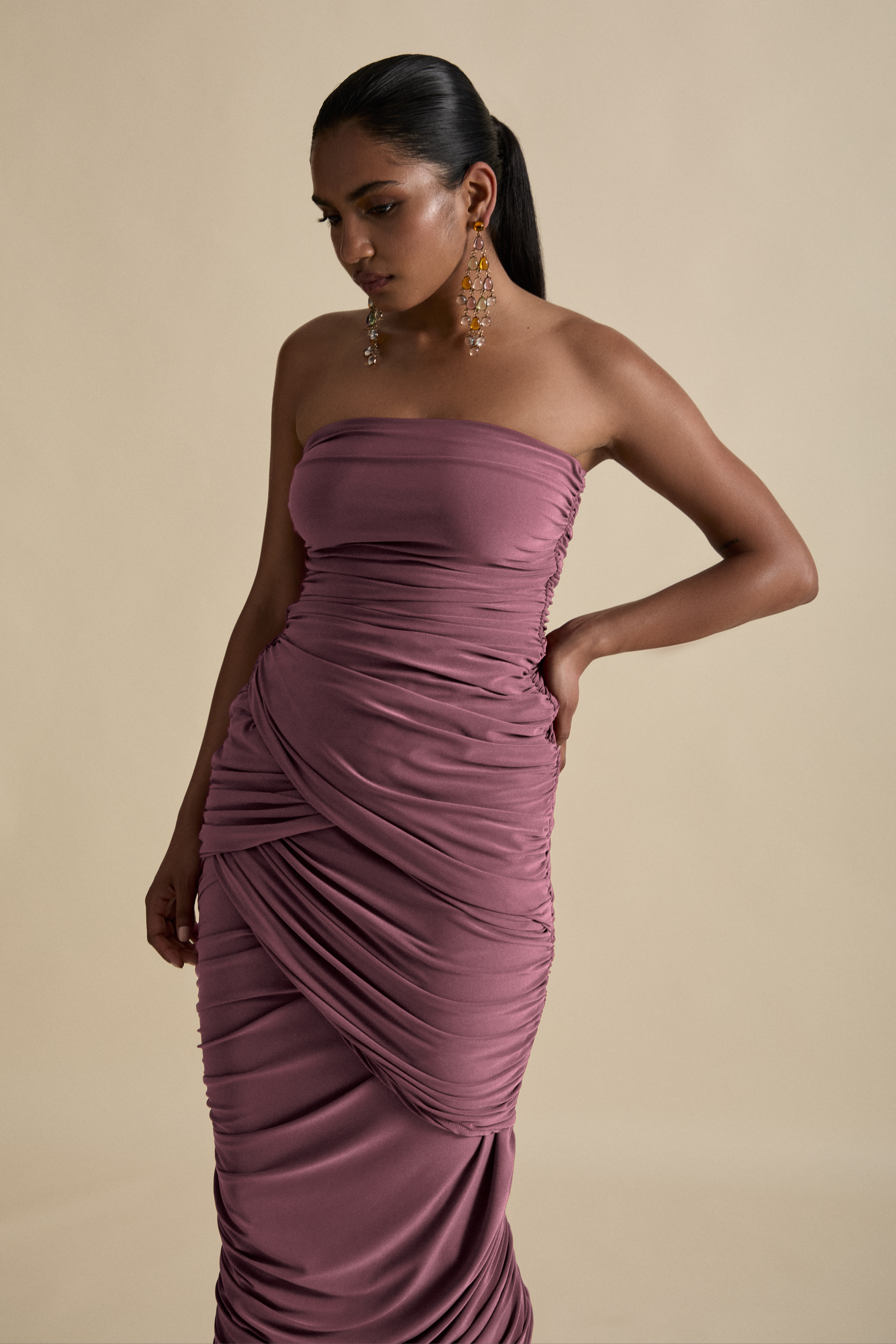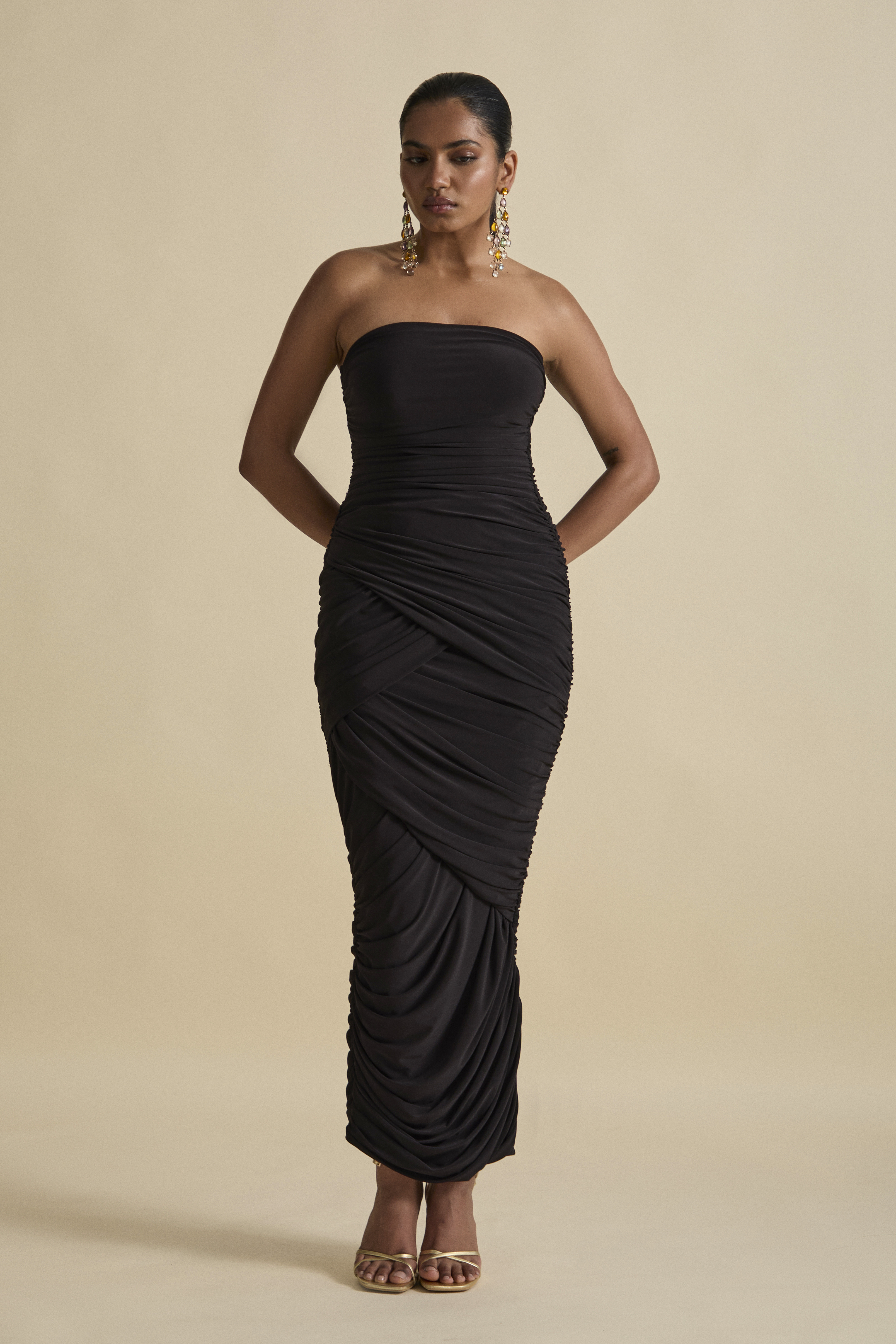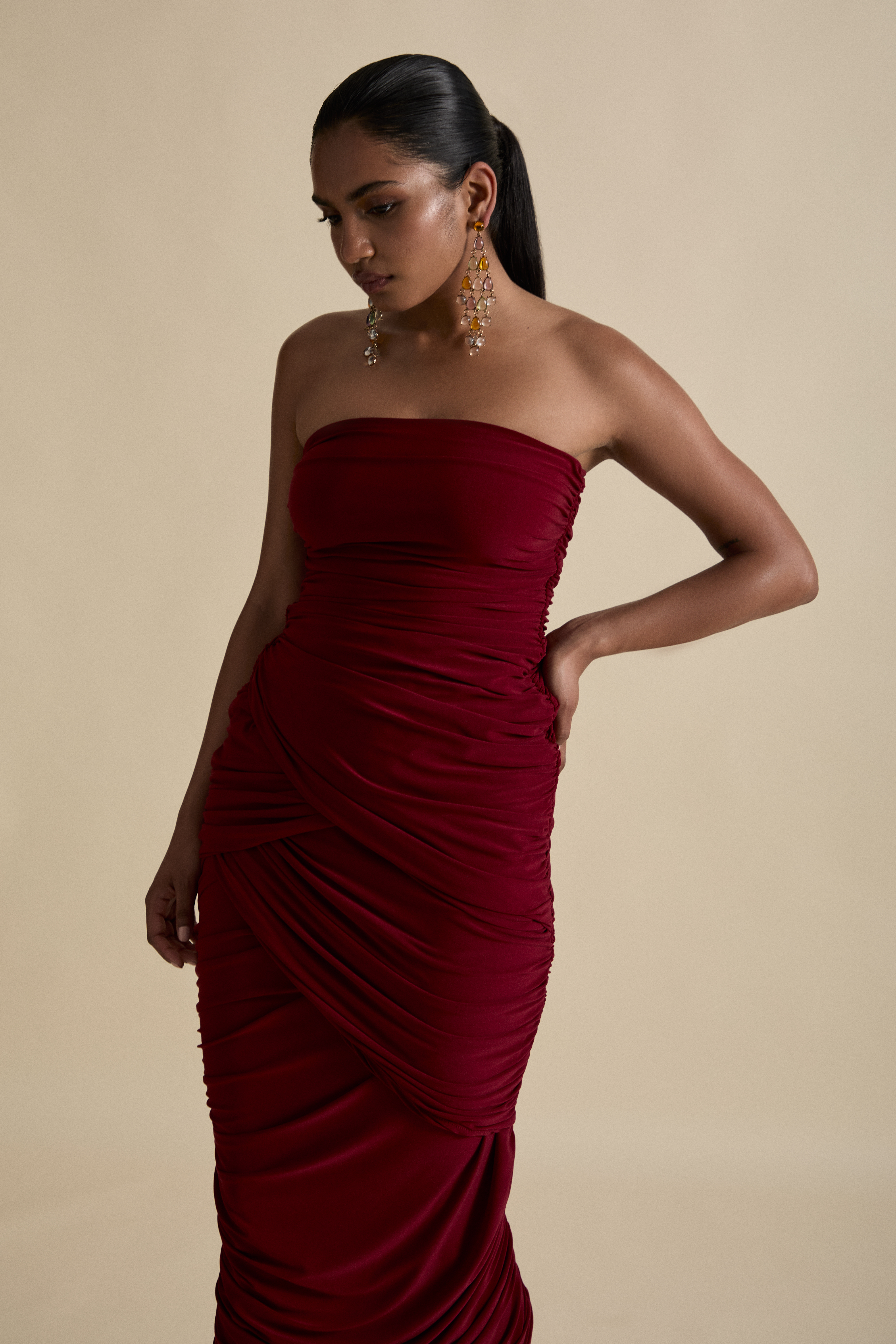 Constructed in locally sourced, premium stretch drape jersey for defined luxury evening wear.