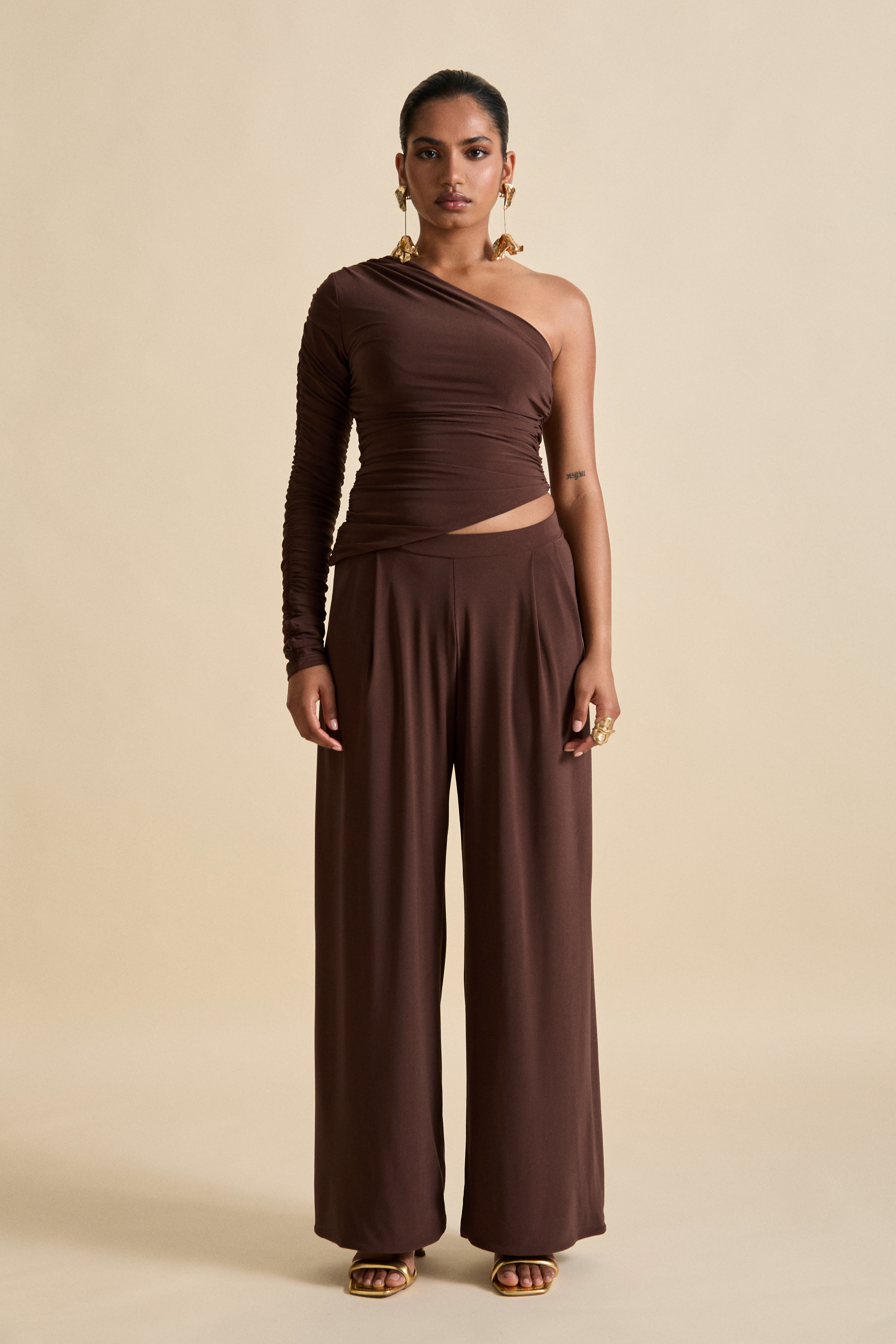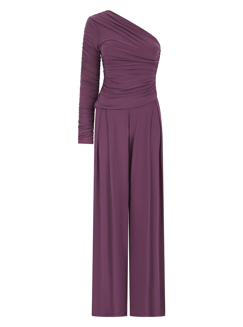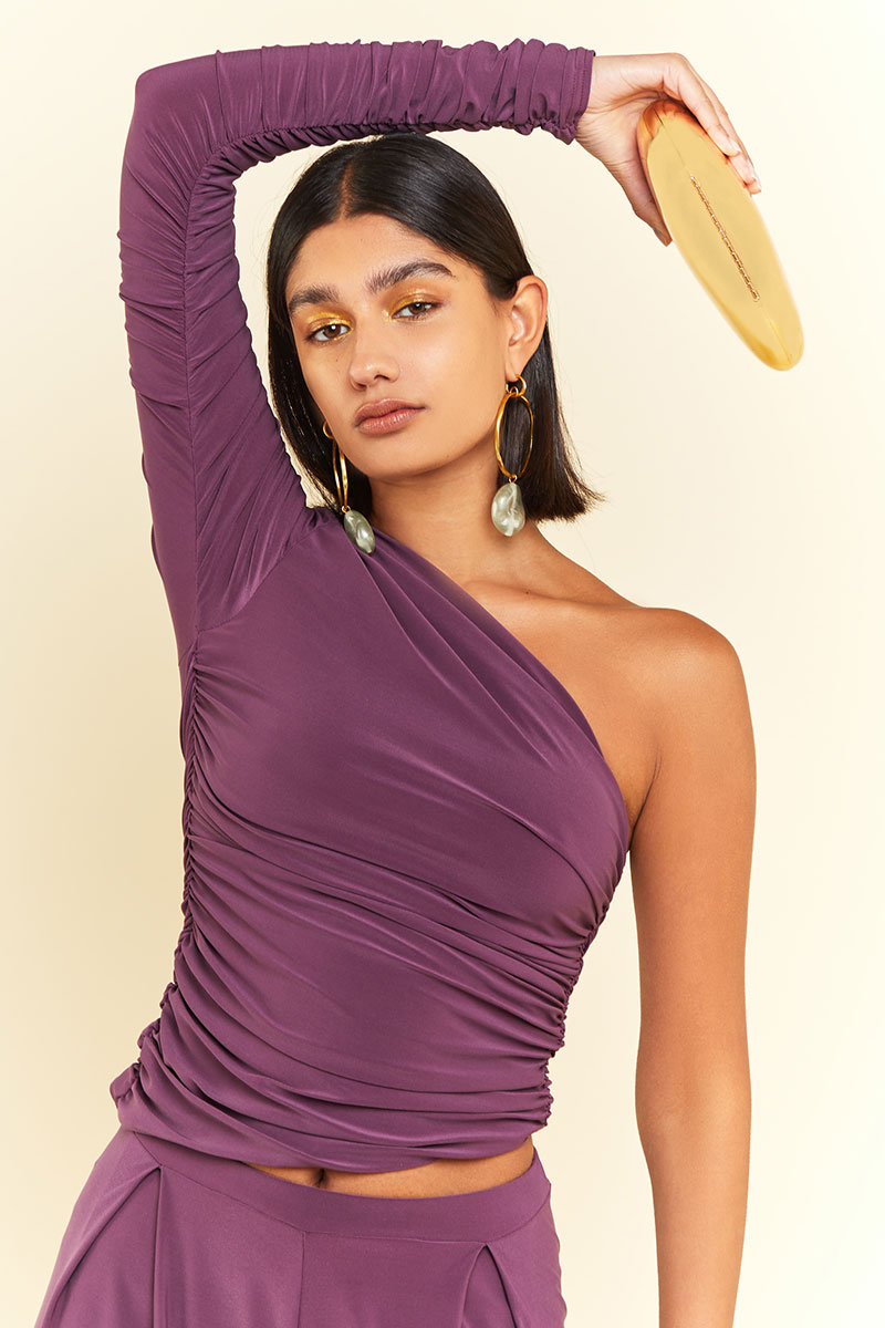 The Nepeta Set, One shoulder ruched asymmetric top provides sultry glamour paired with pleat detail trousers for the perfect merging of sophistication and elegance.
