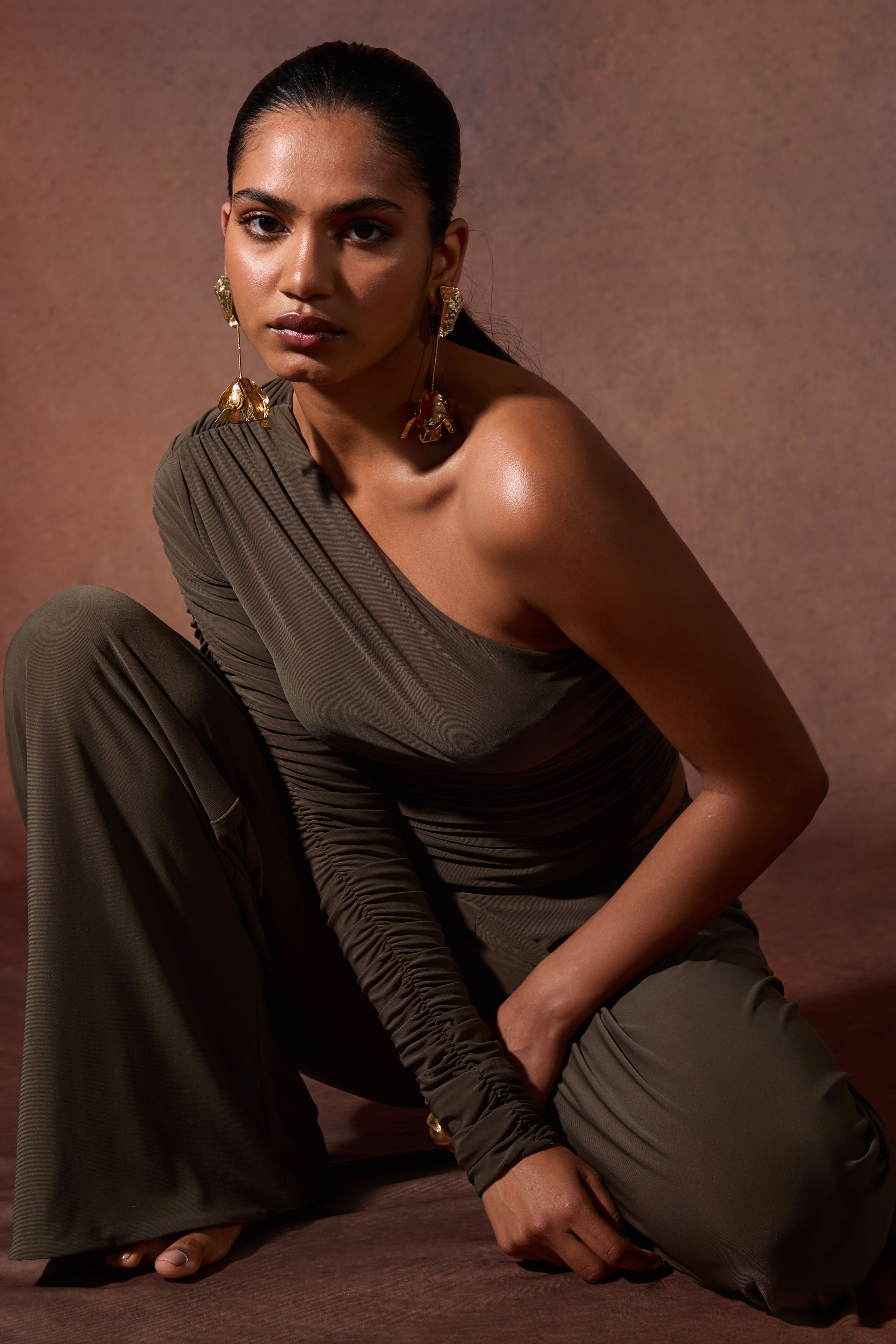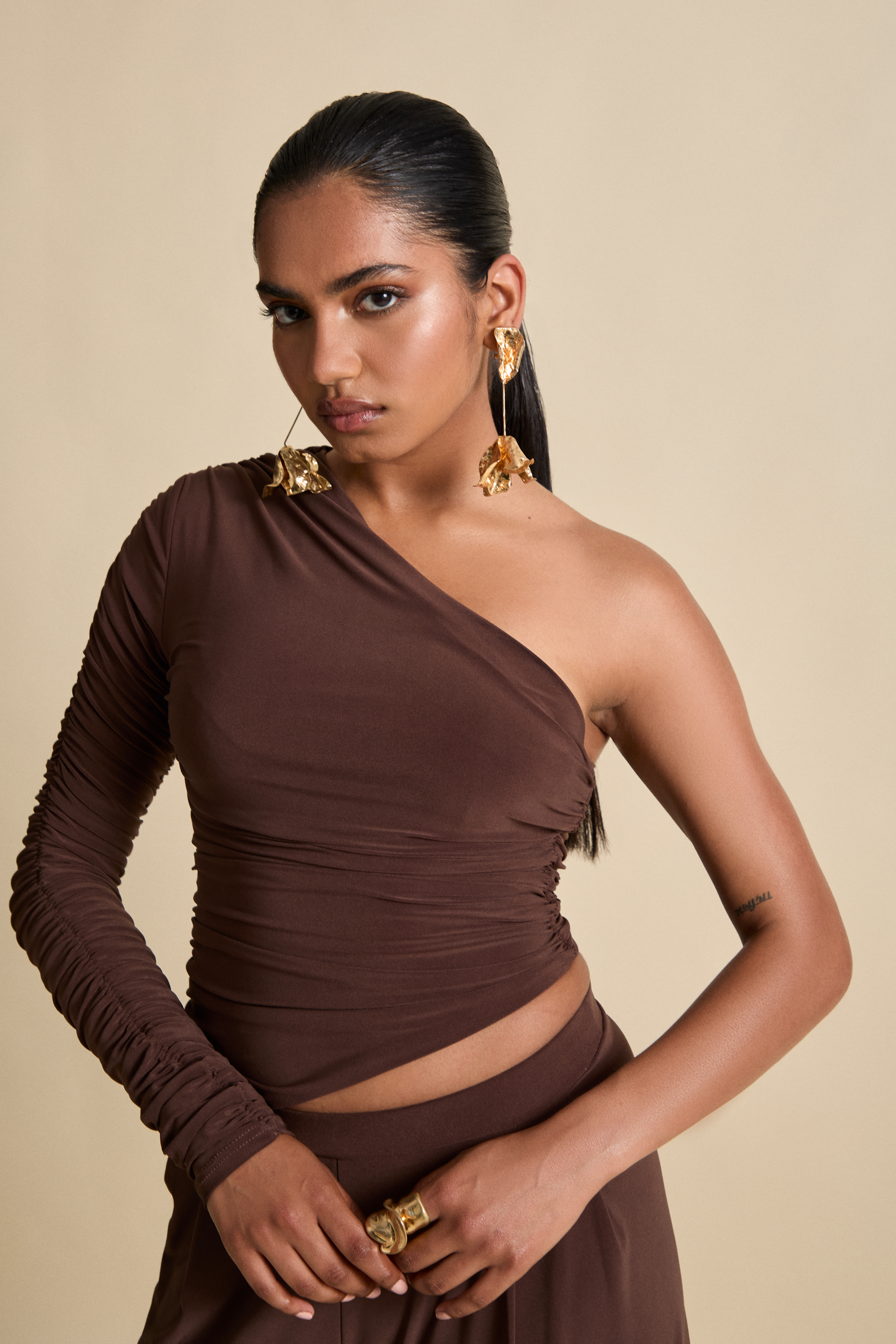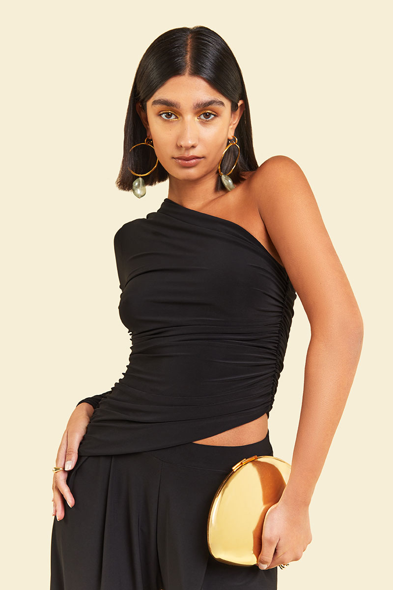 The Nepeta Set, One shoulder ruched asymmetric top provides sultry glamour paired with pleat detail trousers for the perfect merging of sophistication and elegance.