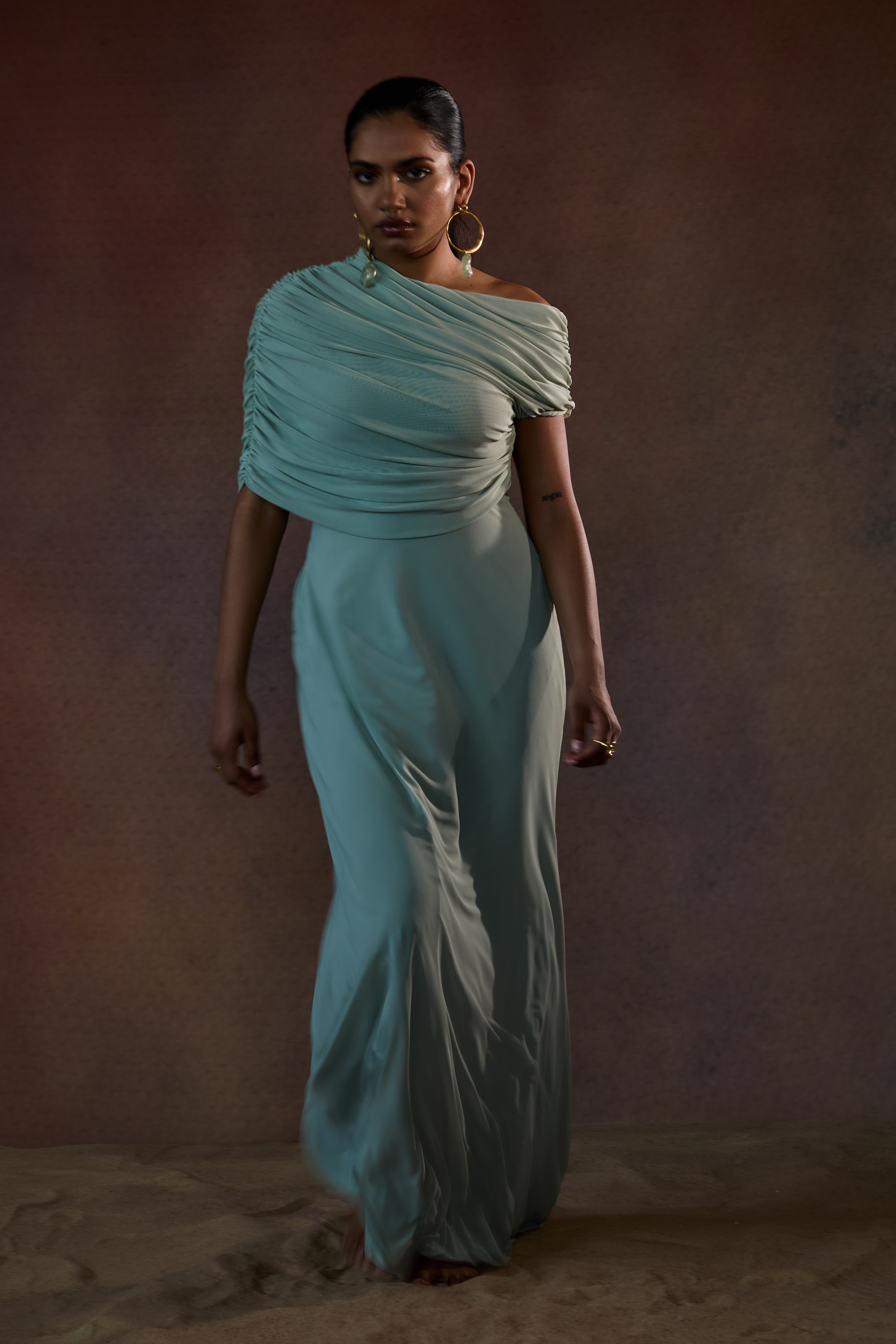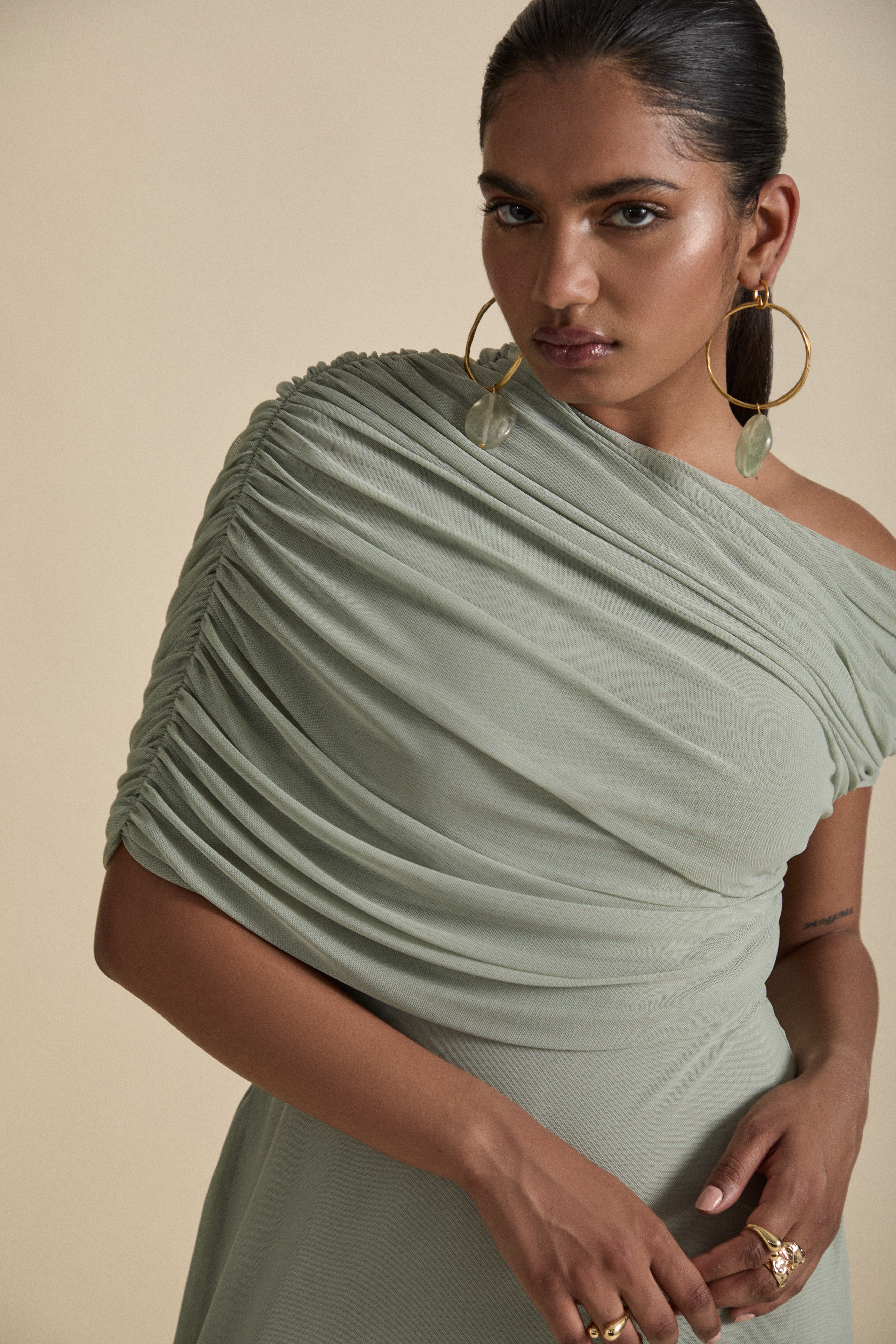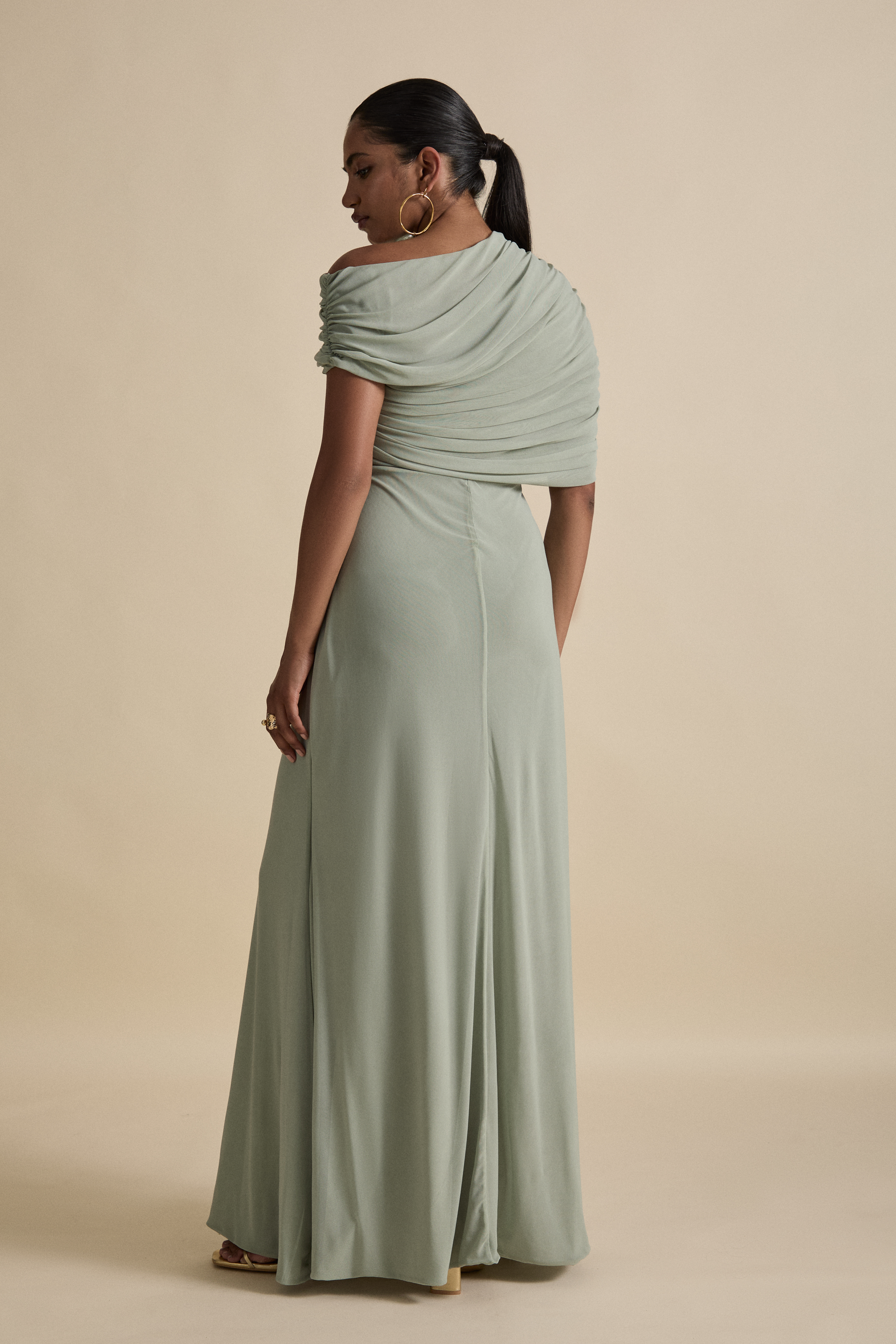 Graceful and unique, a softly cinched waist, and a sweeping floor-length skirt. Delicate neckline drape with our signature ruching details.