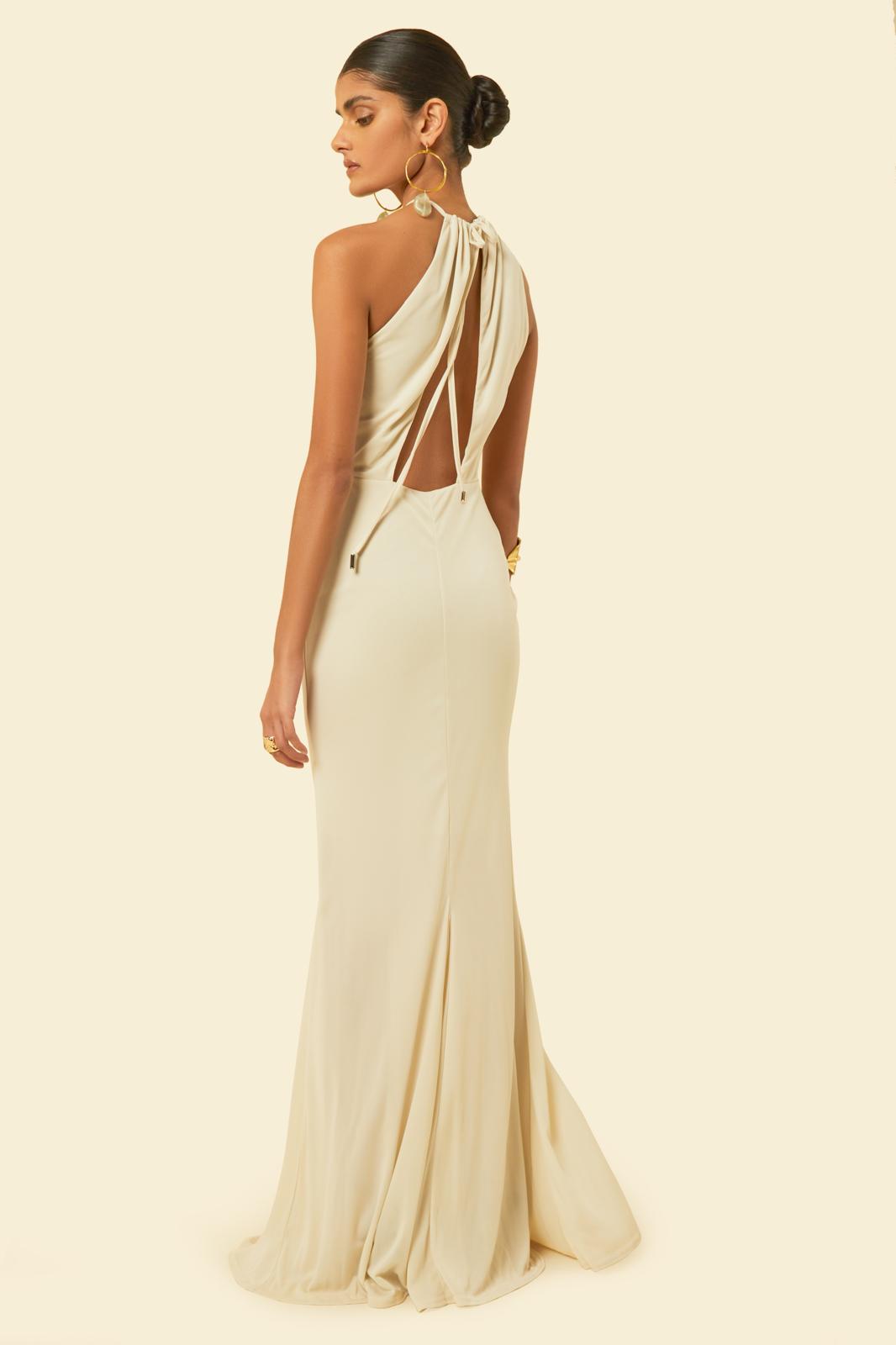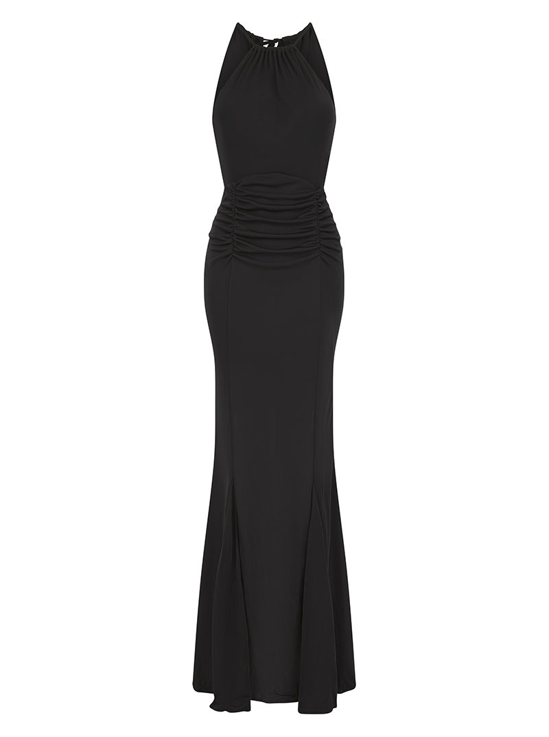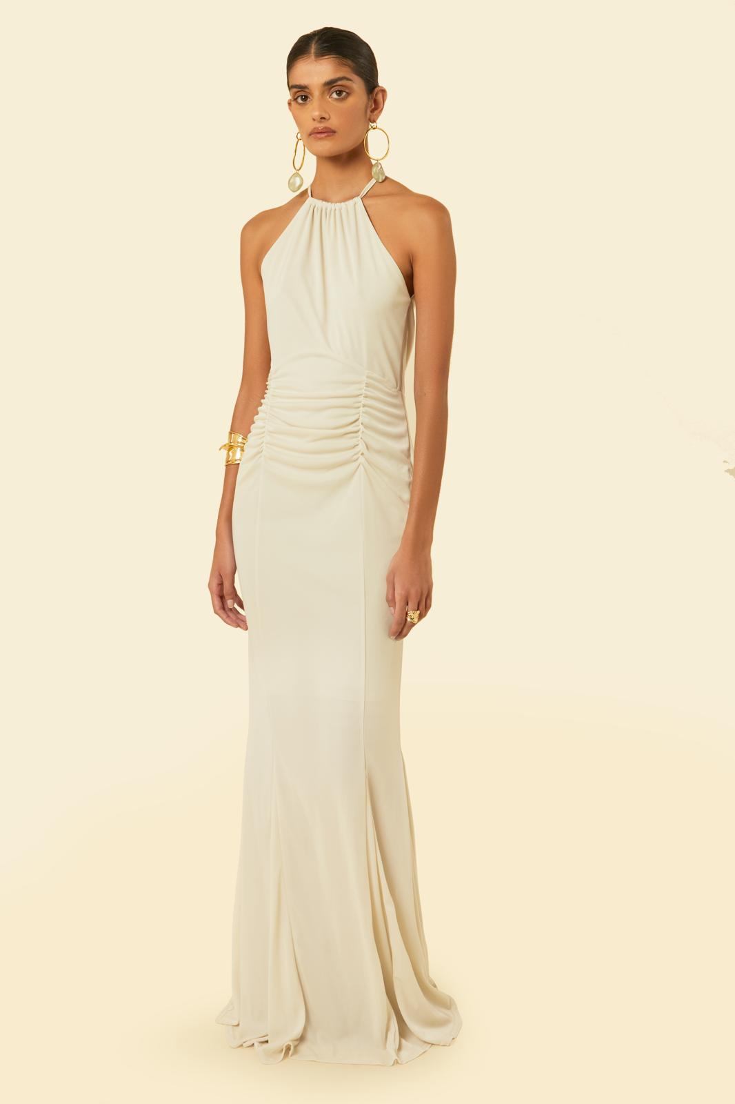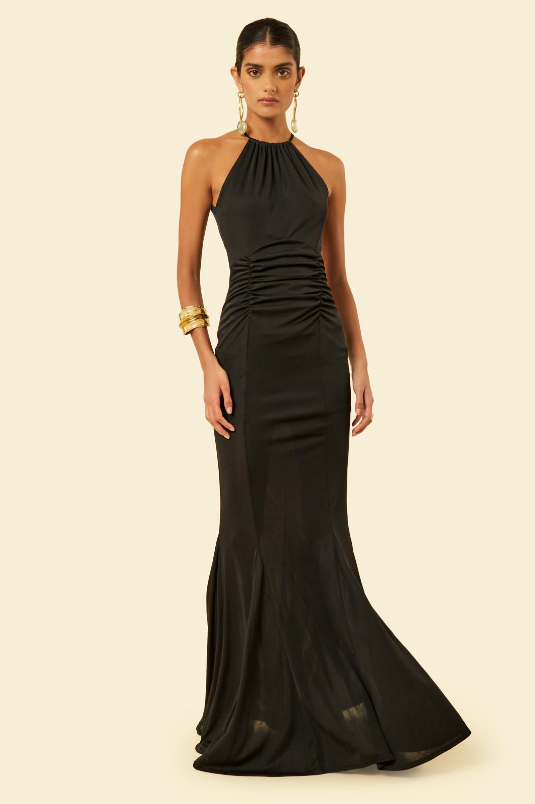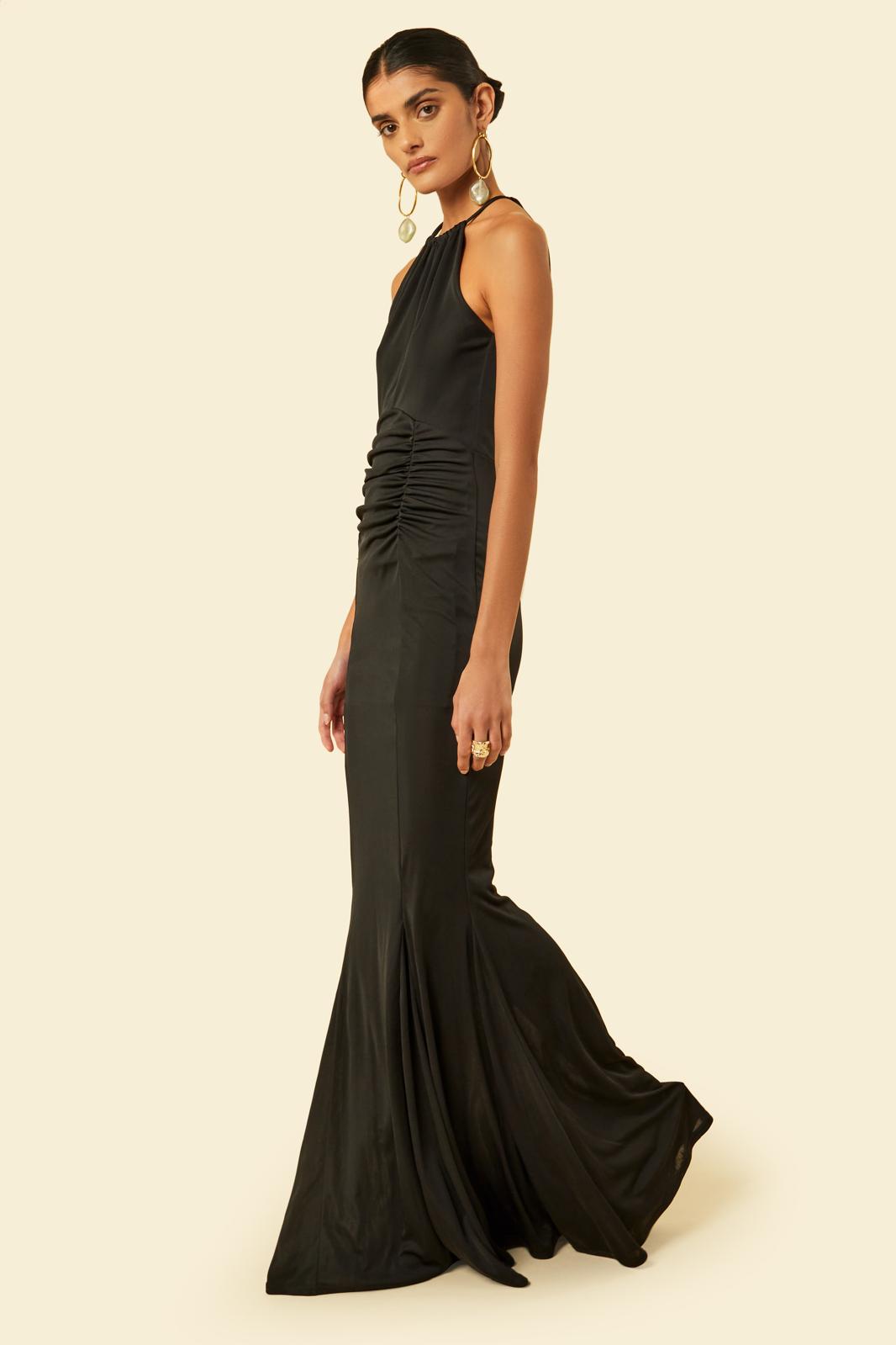 The Plume Maxi Dress, thoughtfully designed to create a beautiful hourglass figure with subtle ruching detail.