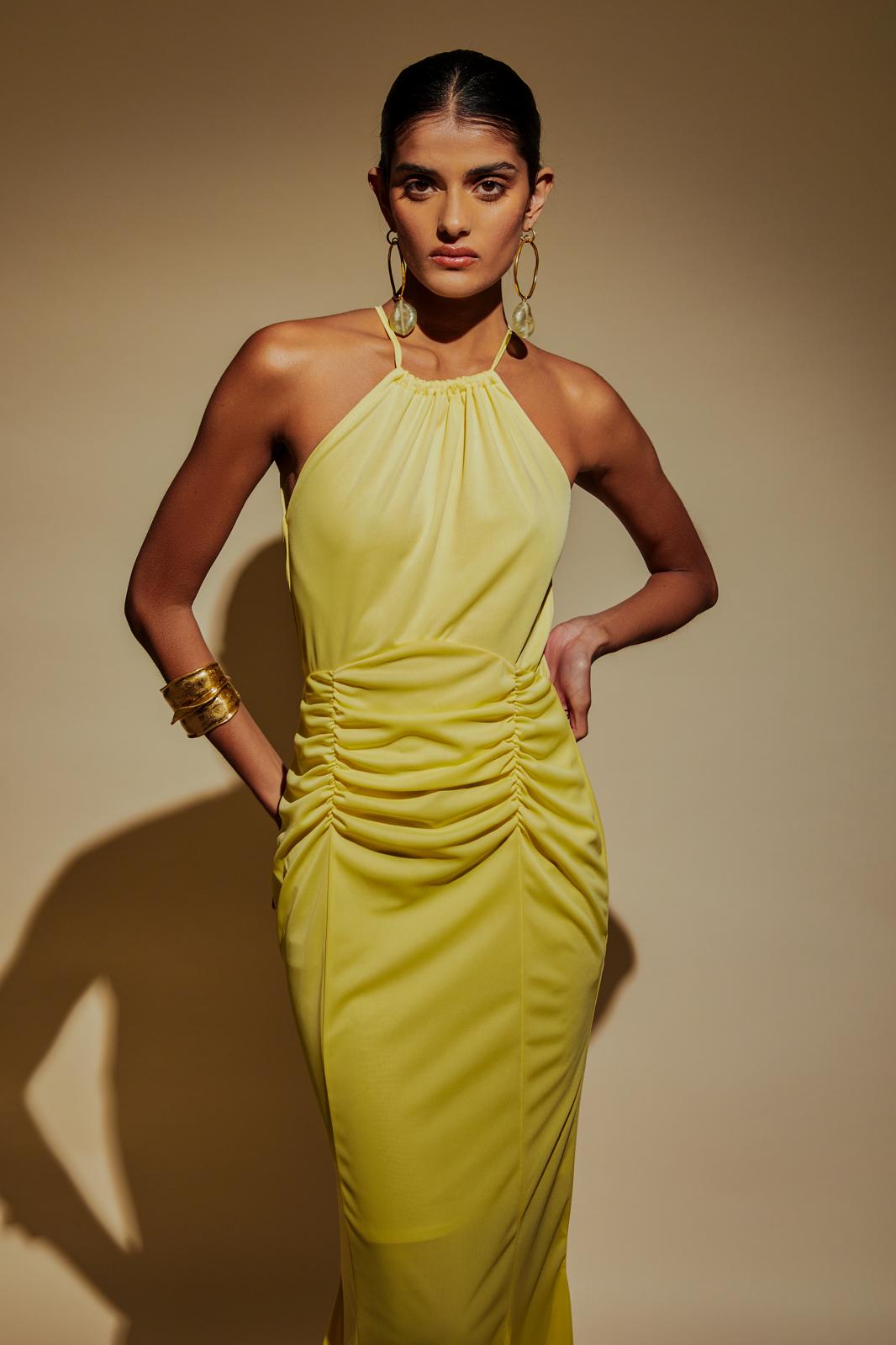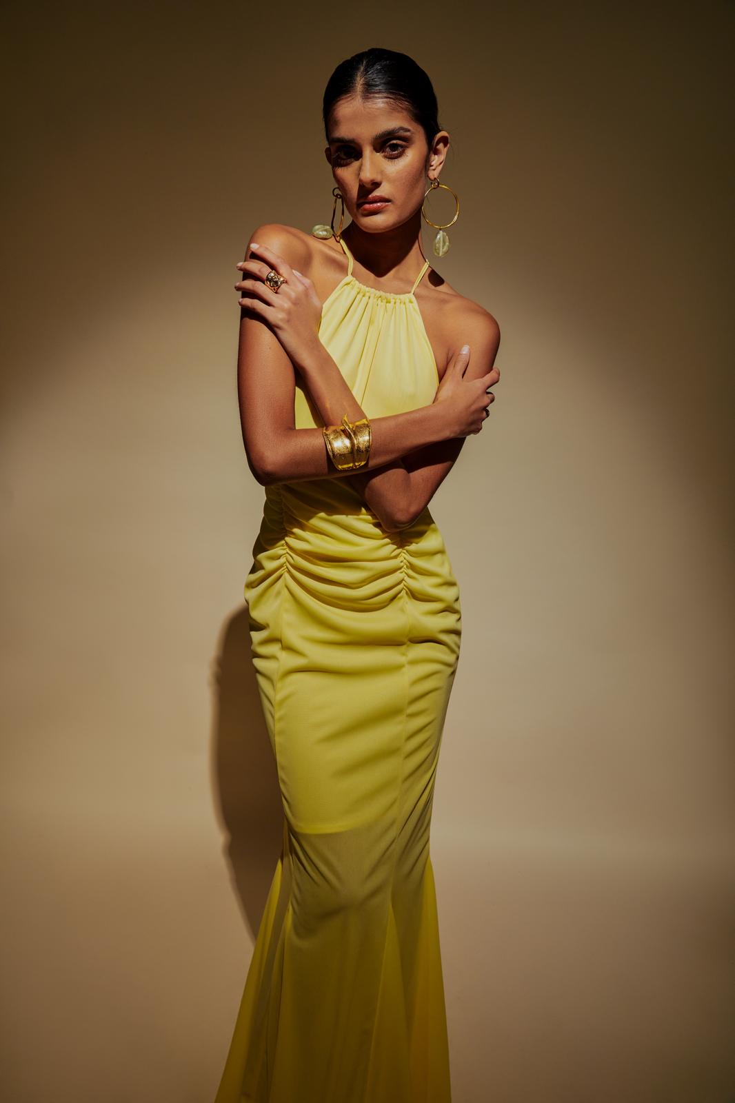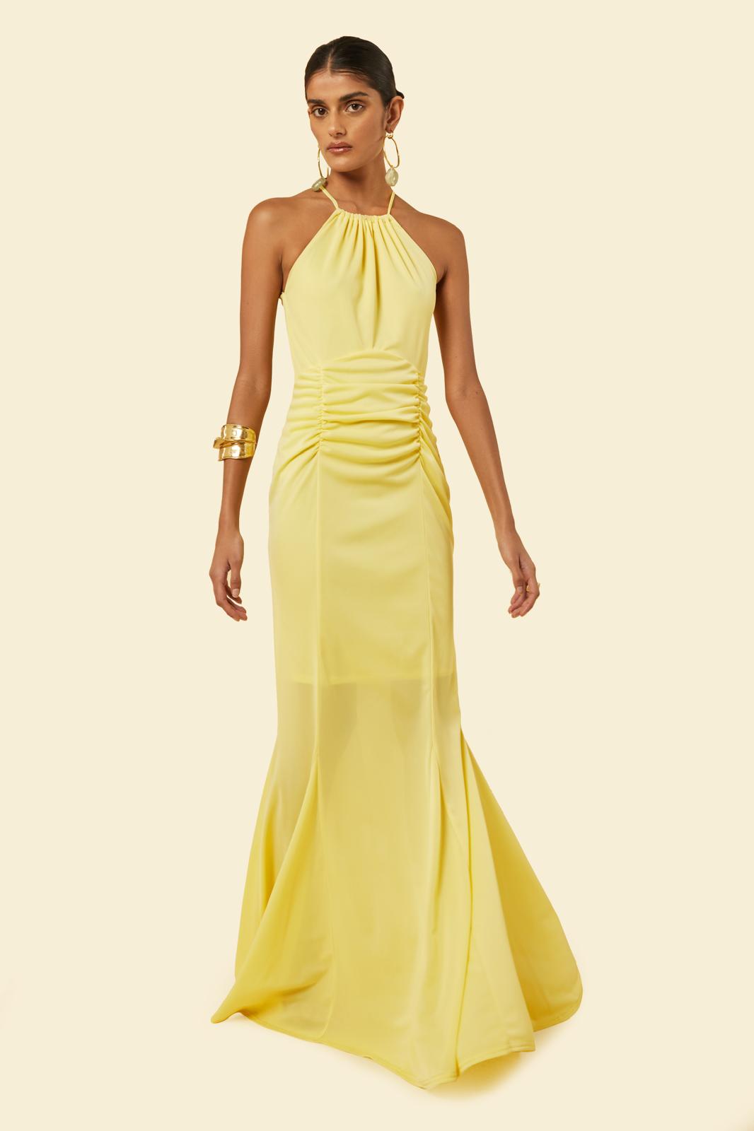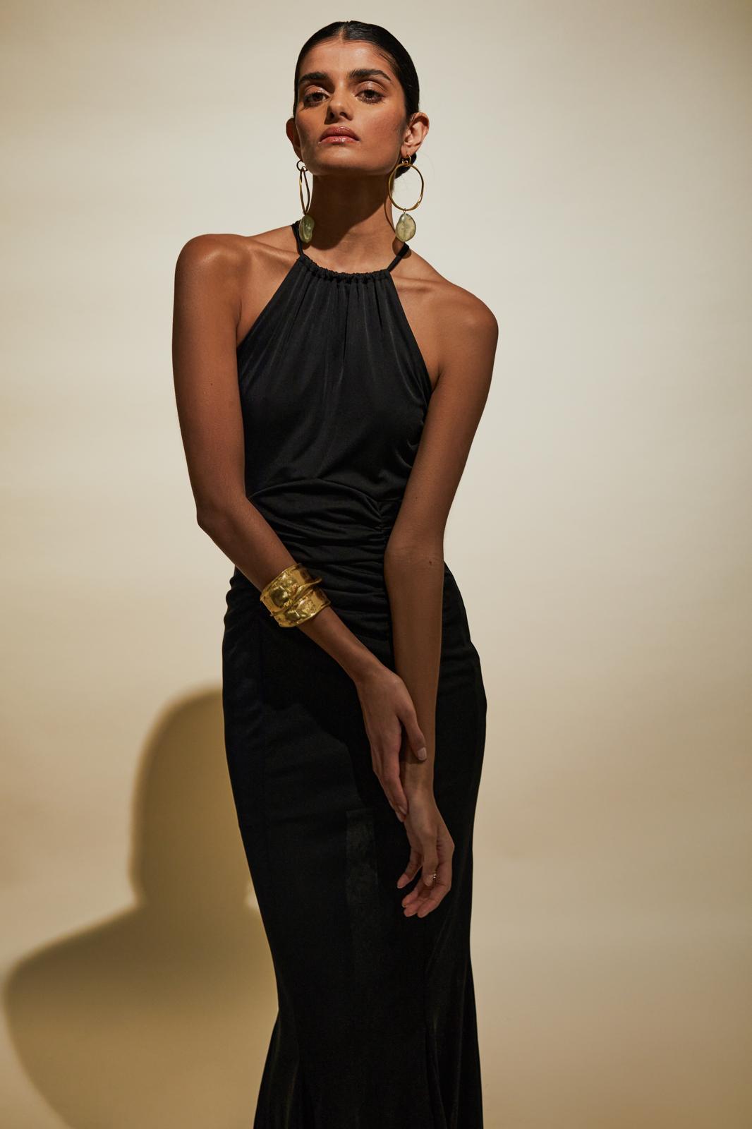 The Plume Maxi Dress, thoughtfully designed to create a beautiful hourglass figure with subtle ruching detail.